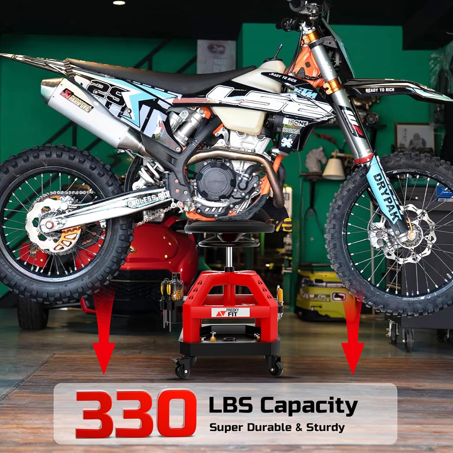 Heavy-duty Mechanic Stool: 24 Pounds Item Weight Heavy Duty for Garage Work. This Mechanic Stool is specially designed with a thick angle steel frame ensuring long-lasting performance and reliability. Its design can withstand heavy use with an overall weight capacity of around 330 pounds. It is a sturdy and practical choice for use in garages workshops & any other heavy duty work place