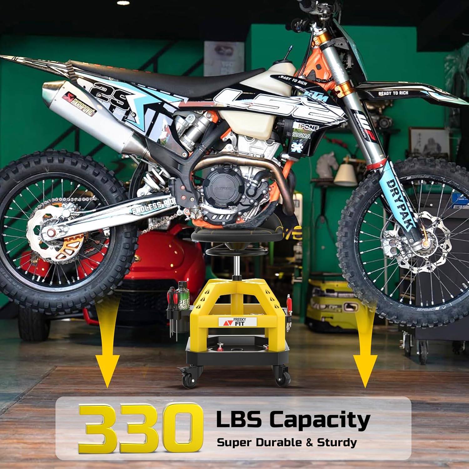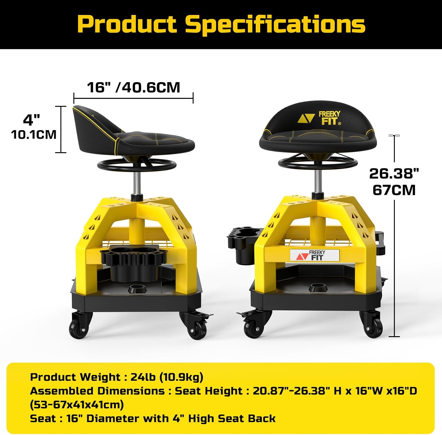 Heavy-duty Mechanic Stool: 24 Pounds Item Weight Heavy Duty for Garage Work. This Mechanic Stool is specially designed with a thick angle steel frame ensuring long-lasting performance and reliability. Its design can withstand heavy use with an overall weight capacity of around 330 pounds. It is a sturdy and practical choice for use in garages workshops & any other heavy duty work place