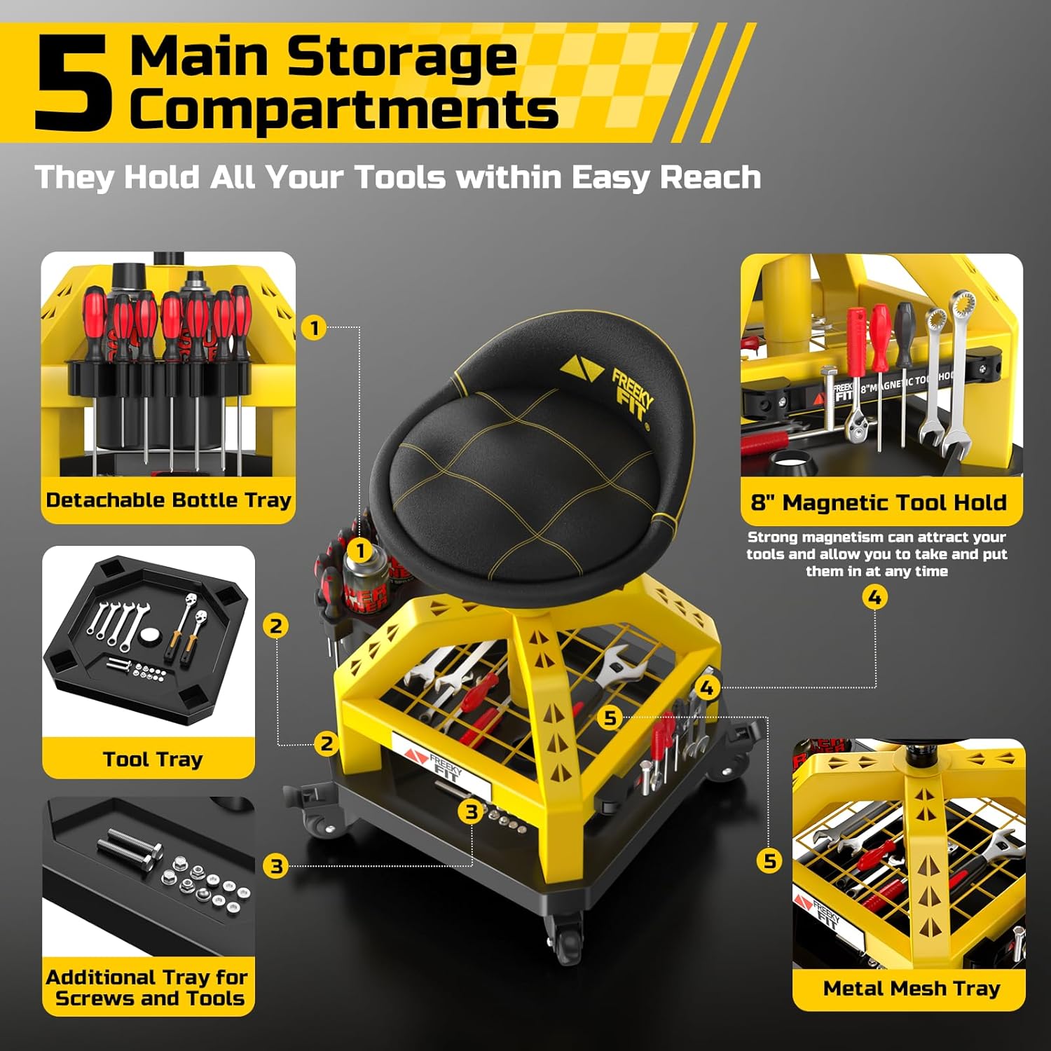 Engineering Design & High-Storage: Our Rolling Seat with square tube and steel ring structure provides space for resting the feet and the design of this automotive repair chair includes two tool trays located under the seat. The first layer is a metal mesh tray and the second layer is a solid plastic tray making it convenient to store and access necessary tools and parts. In addition we are also equipped with utility tool rack. It helps to keep the work area tidy and reduces the need for frequent tool movement