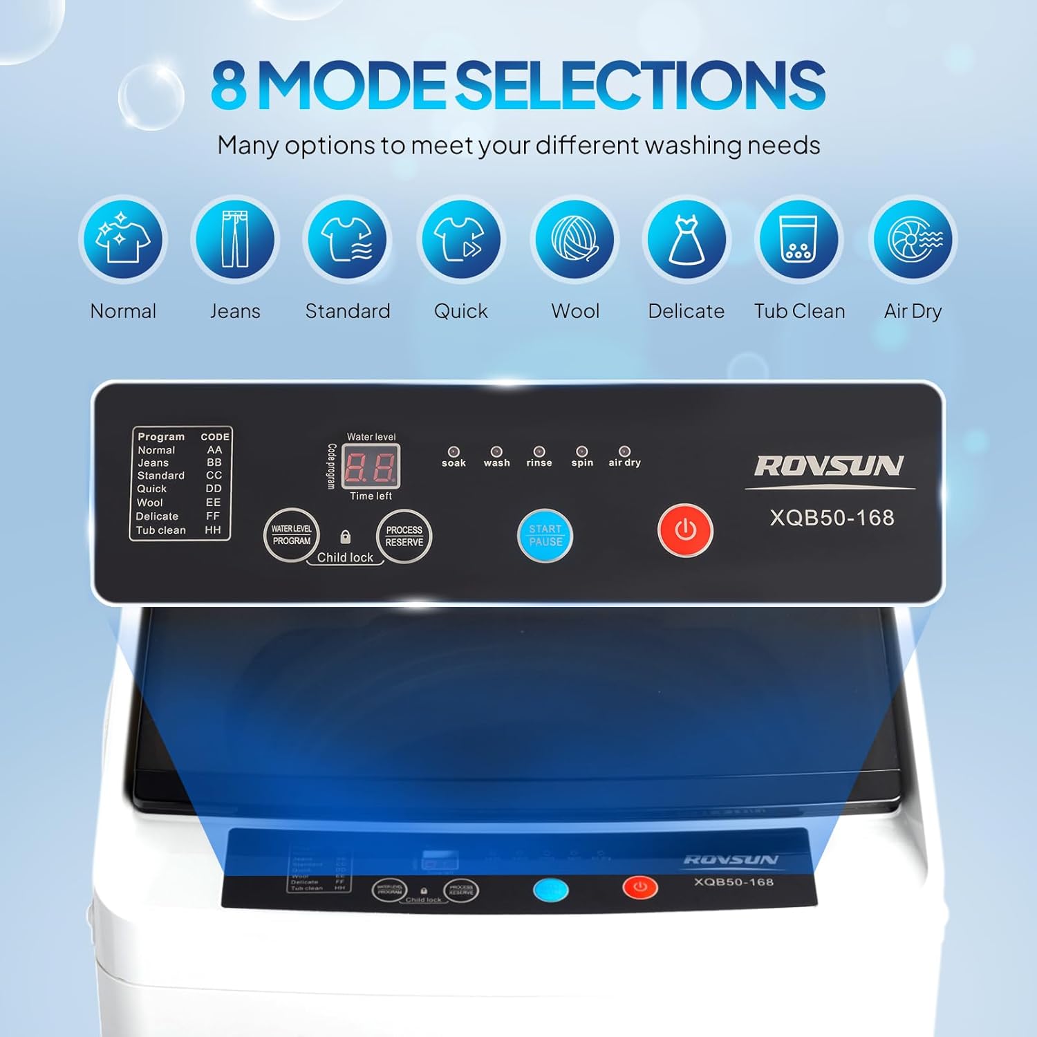 Versatile Washing Options Choose from 8 different washing modes and 5 water levels making this clothes washer perfect for anything from heavily soiled items to delicate fabrics. Enjoy quick washes in just 26 minutes making it ideal for busy lifestyles and different laundry demands. .
