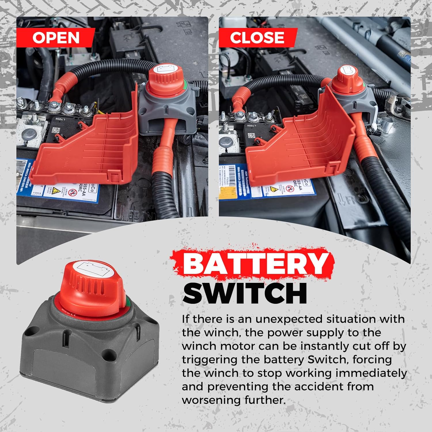 [Superior safety protection] Equipped with a power-off switch to prevent accidental power loss of the vehicle. Equipped with a winch guide mouth protection block that can perfectly store the winch hook.