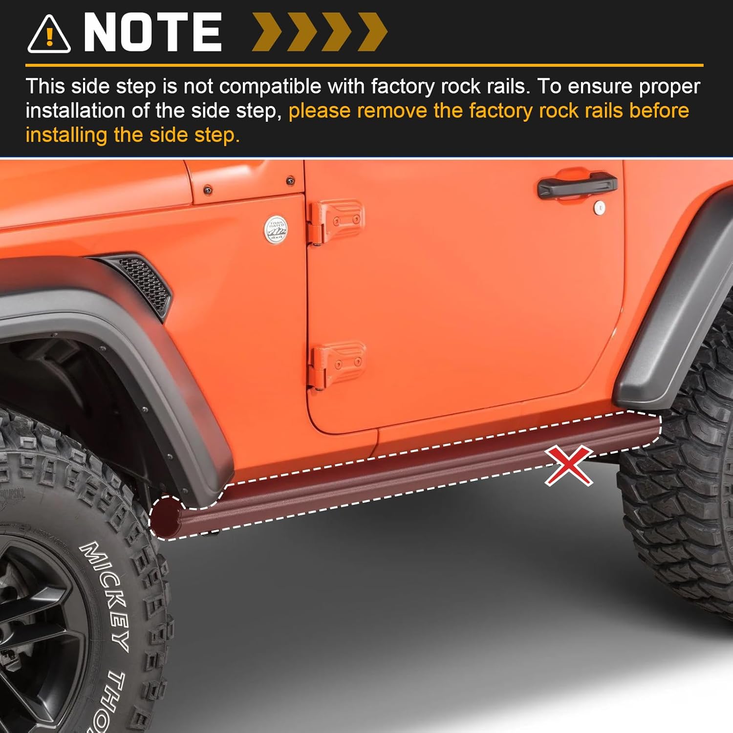 Note: This side step is not compatible with factory rock rails. To ensure proper installation of the side step please remove the factory rock rails before installing the side step.