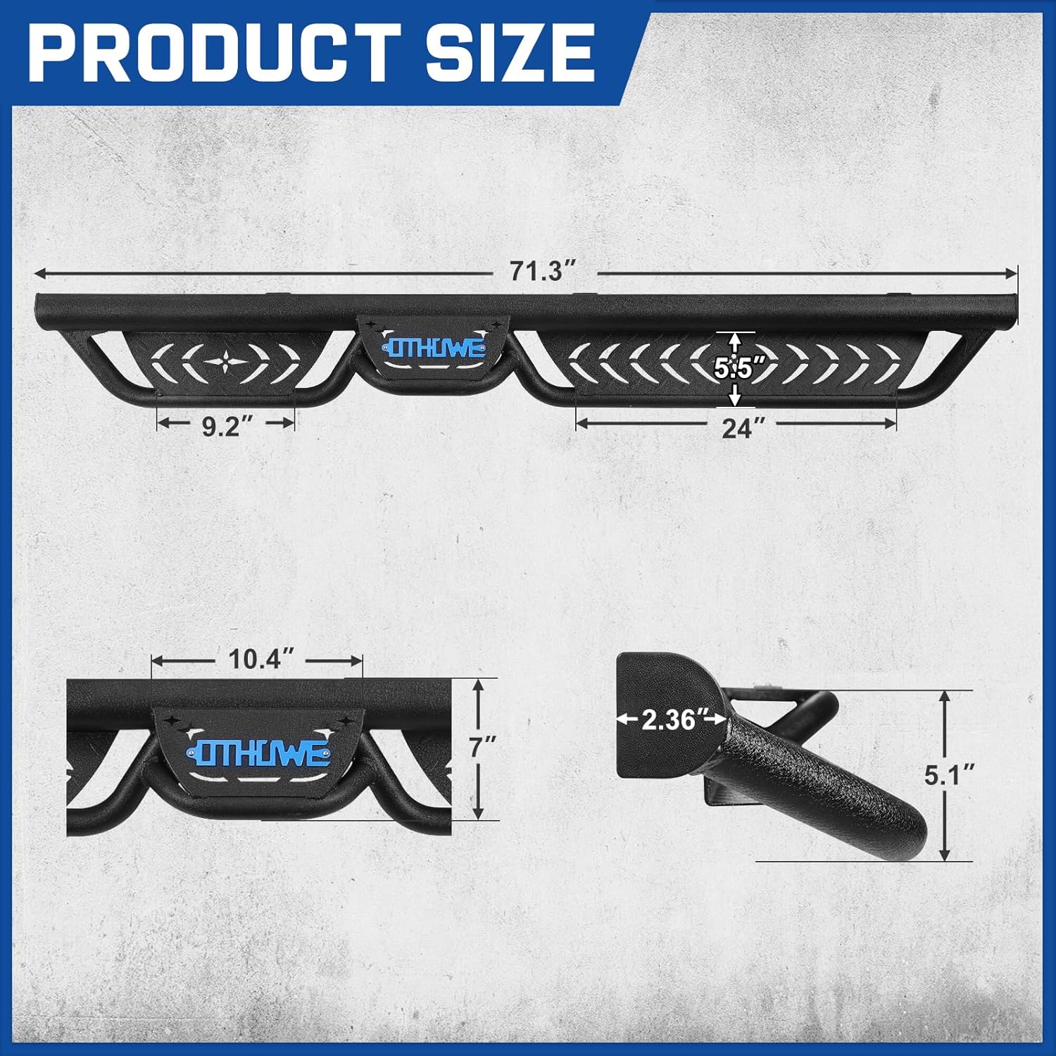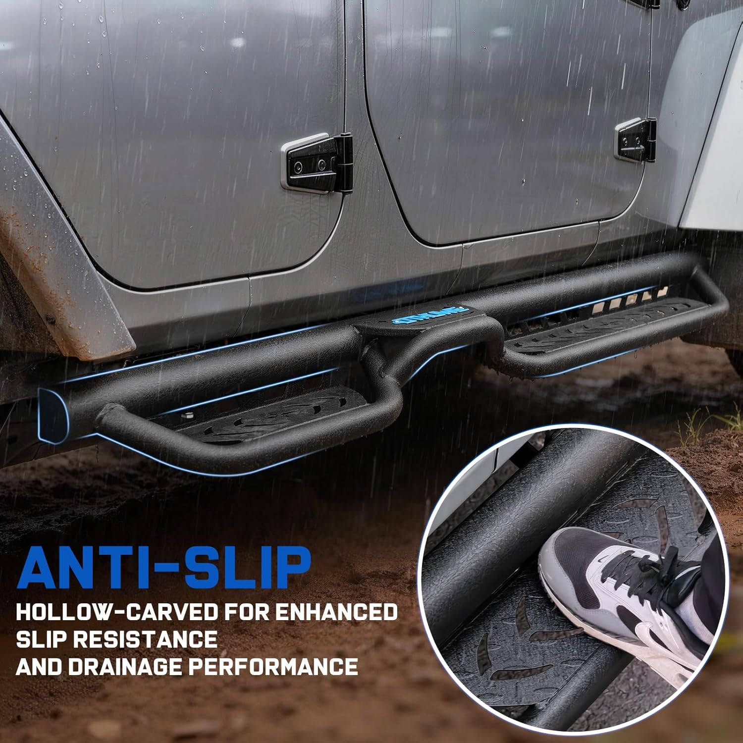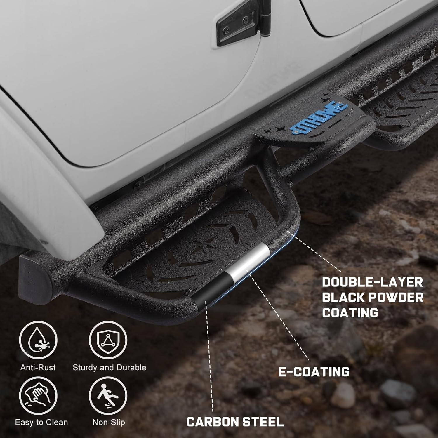 MaterialThis Side Step is forged from heavy-duty carbon steel delivering high structural strength and impact resistance. Its surface features a premium black powder coating that provides exceptional rust protection. With this dual-process reinforcement it withstands harsh environments like salt spray and muddy conditions supporting up to 550 pounds per side without bending.