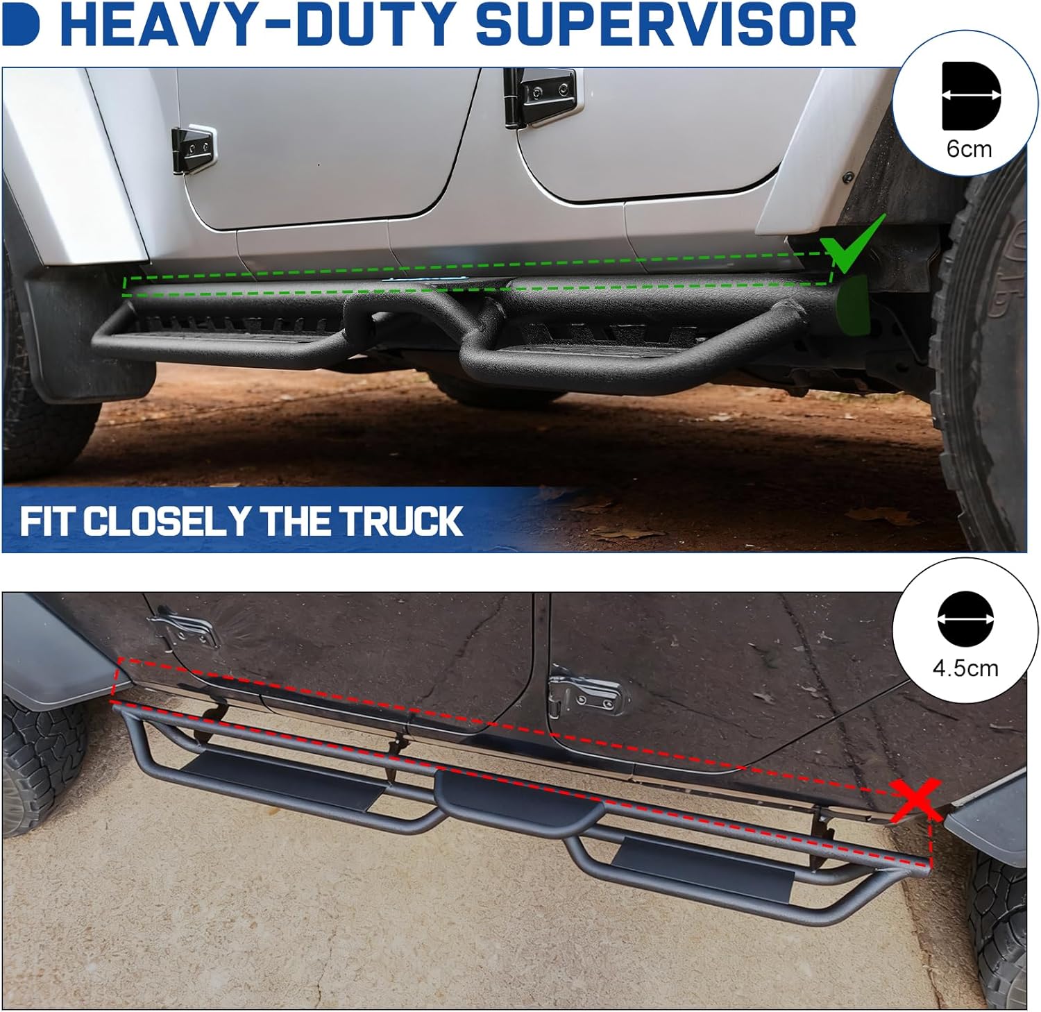 Heavy-Duty 60mm Diameter Tube Design: Our side steps feature 60mm thickened main tubes significantly enhancing the load-bearing capacity of the main beam. This design offers a distinct advantage over the industry standard 45mm diameter tubes. The semi-circular profile ensures a snug fit against the truck body while effectively preventing deformation.