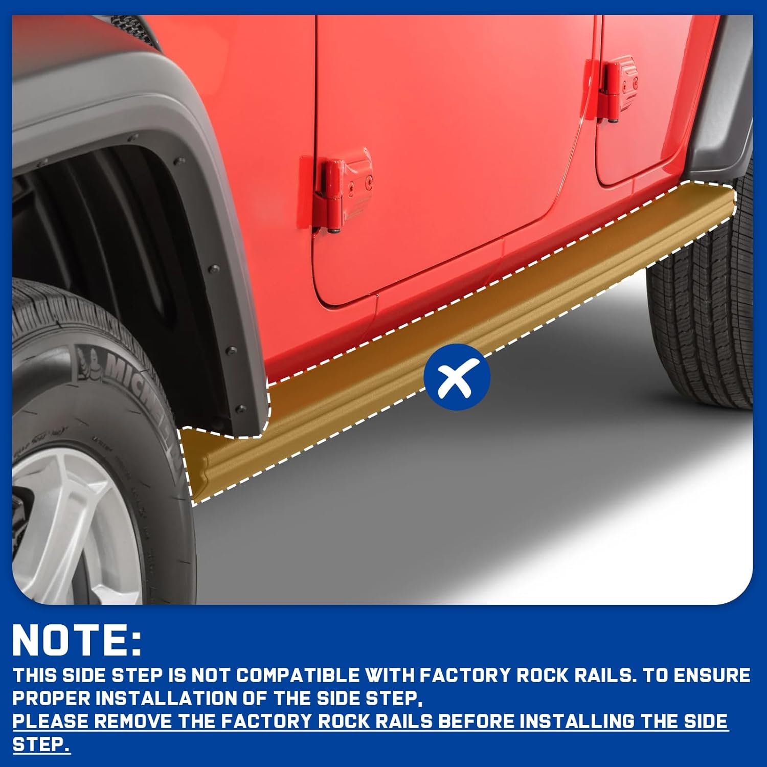 Note: This side step doesn't fit with factory rock rails. To make sure you install the side step properly you need to remove the factory rock rails first.