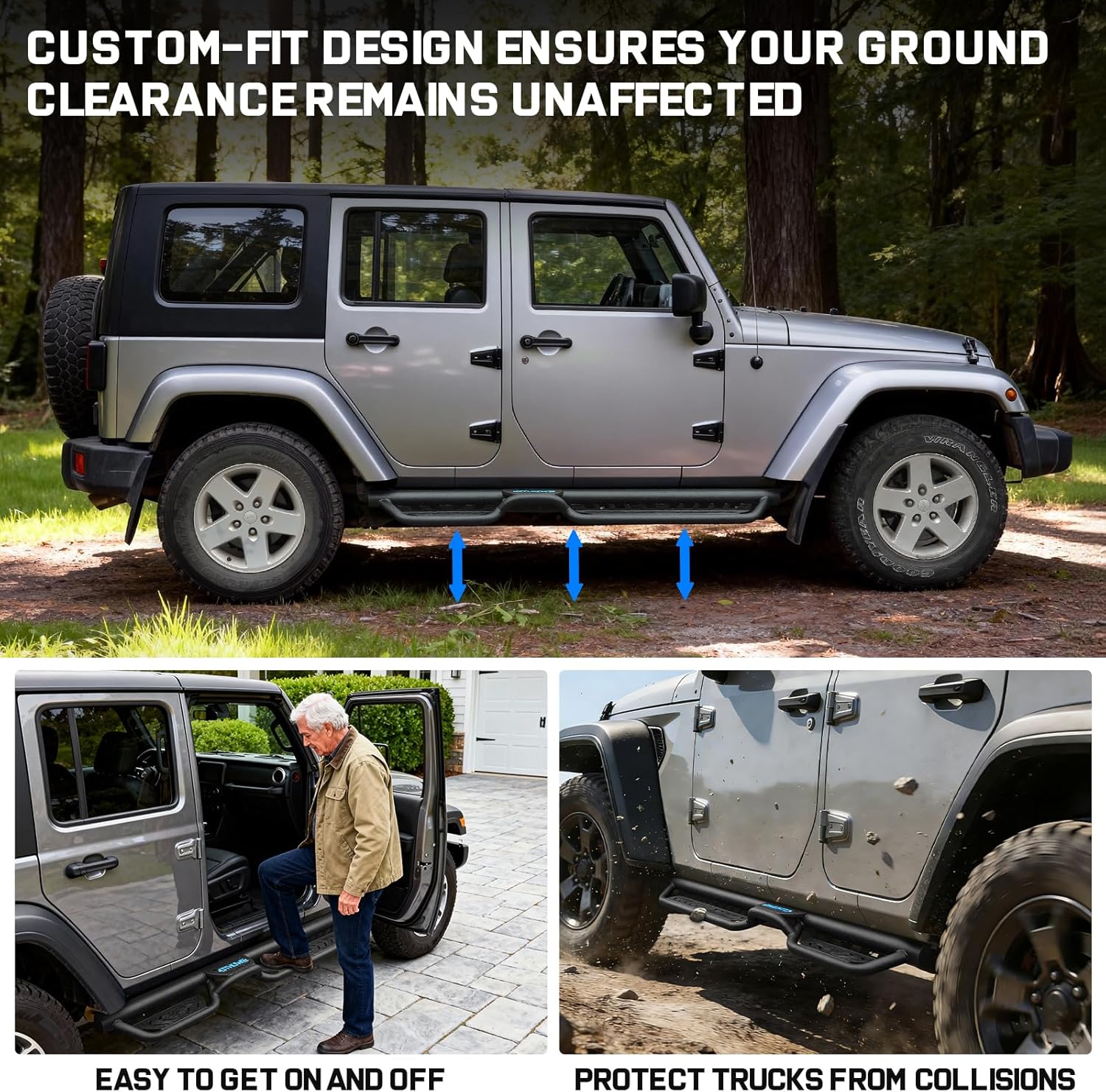 Two-Stair truck running boards: Featuring a unique two-stair structure to ensure safe entry and exit for all ages. The elevated center step facilitates loading/unloading items from the roof and roof cleaning while maintaining ample ground clearance. The streamlined Side Step enhances your truck's appearance and effectively prevents impacts from gravel and debris.