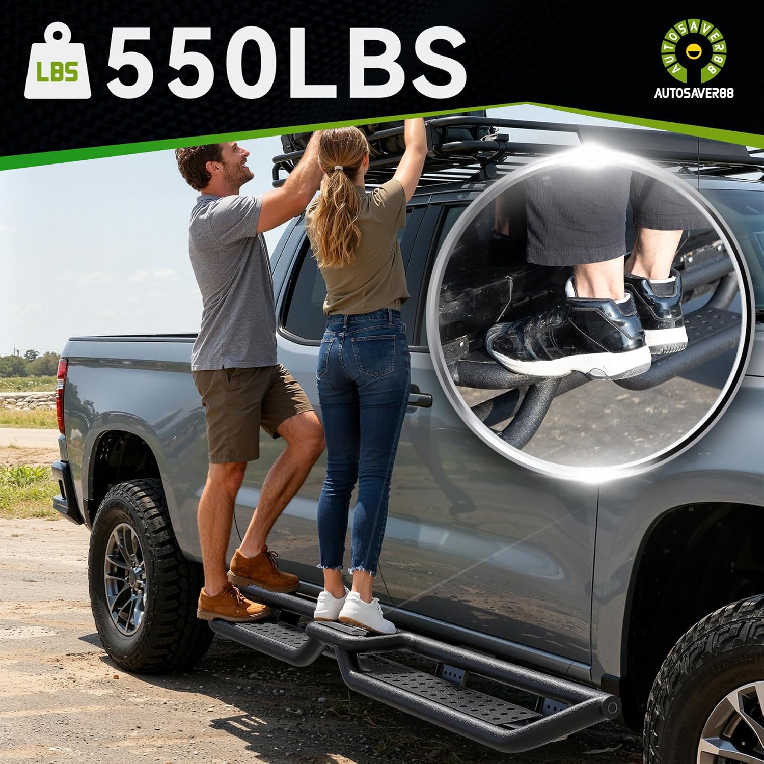 Safe and Sturdy: The 6-inch wide step rails provide a solid foothold for safe and secure access to your truck. Triangular structure of three tubes make an outstanding load-bearing capacity up to 550 lb