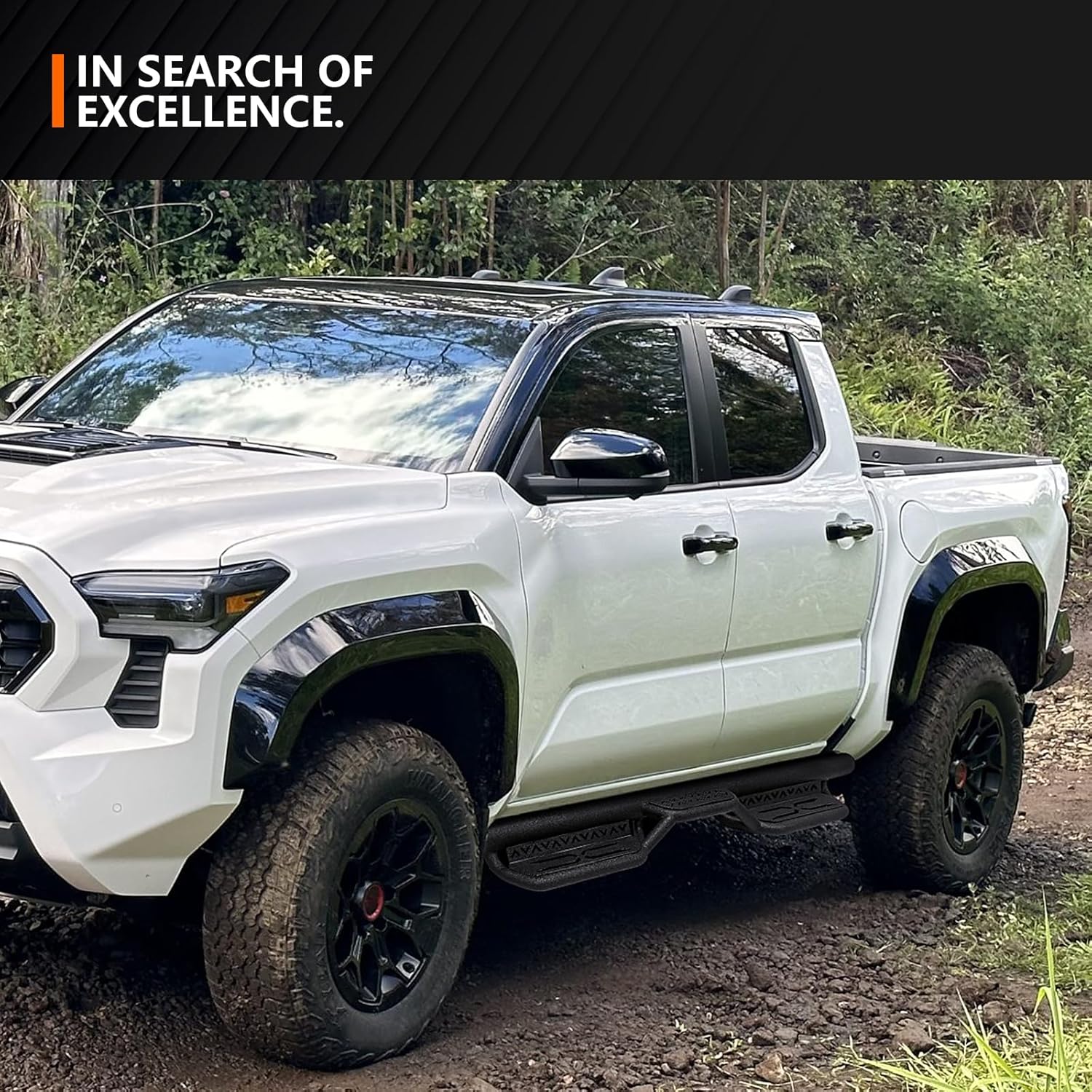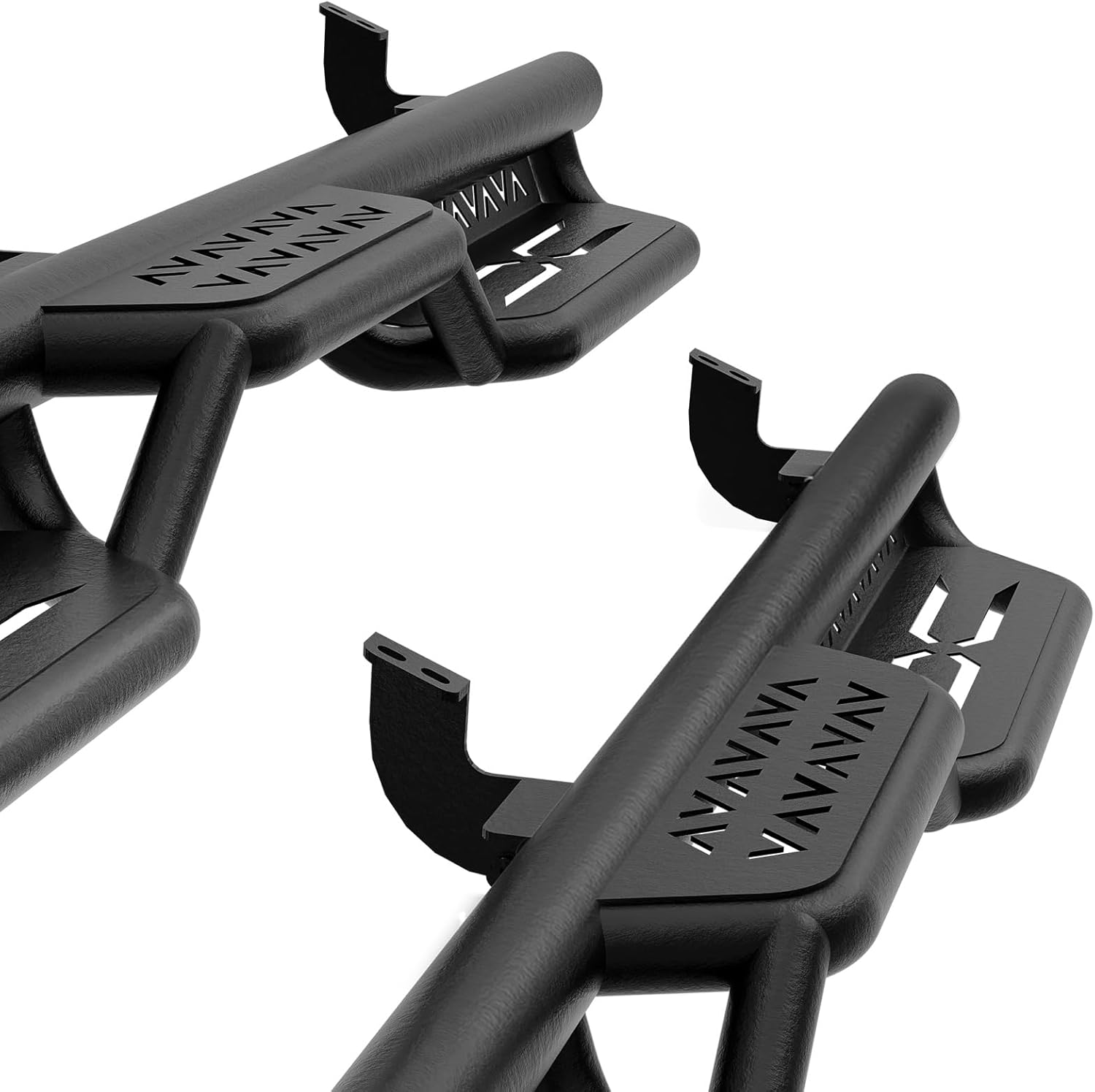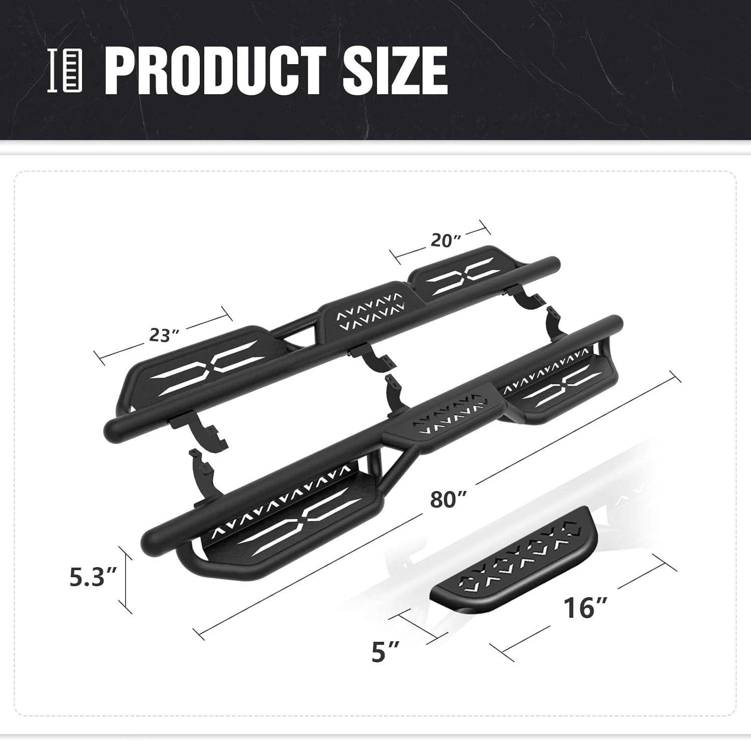 Functional design: The side step features a two-tier layout providing enhanced convenience for vehicles with lift kits and oversized tires. It also facilitates easier roof access. The ultra-thick main tube imparts excellent weight-bearing capacity to the step preventing deformation and offering enhanced vehicle protection. Hollow design in the step area ensures secure and stable stepping prevents water accumulation and reduces driving resistance.