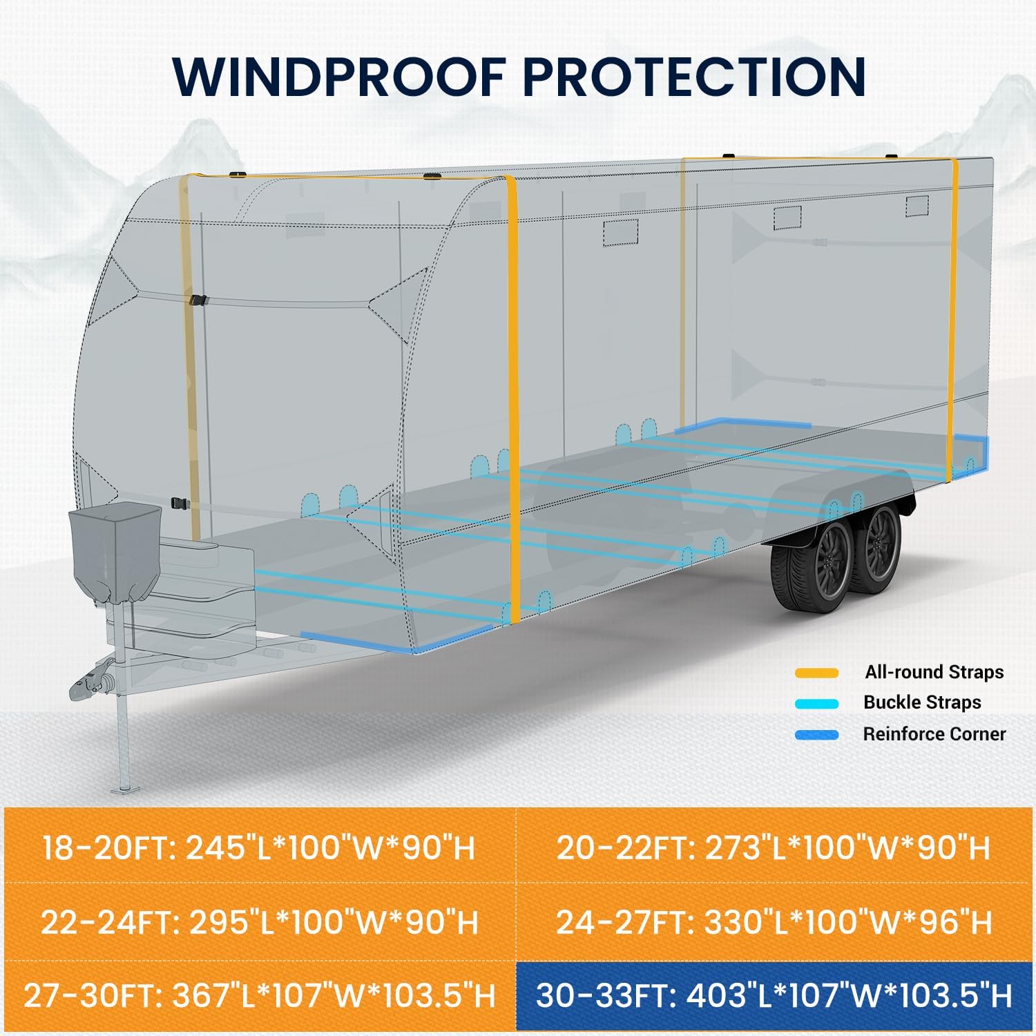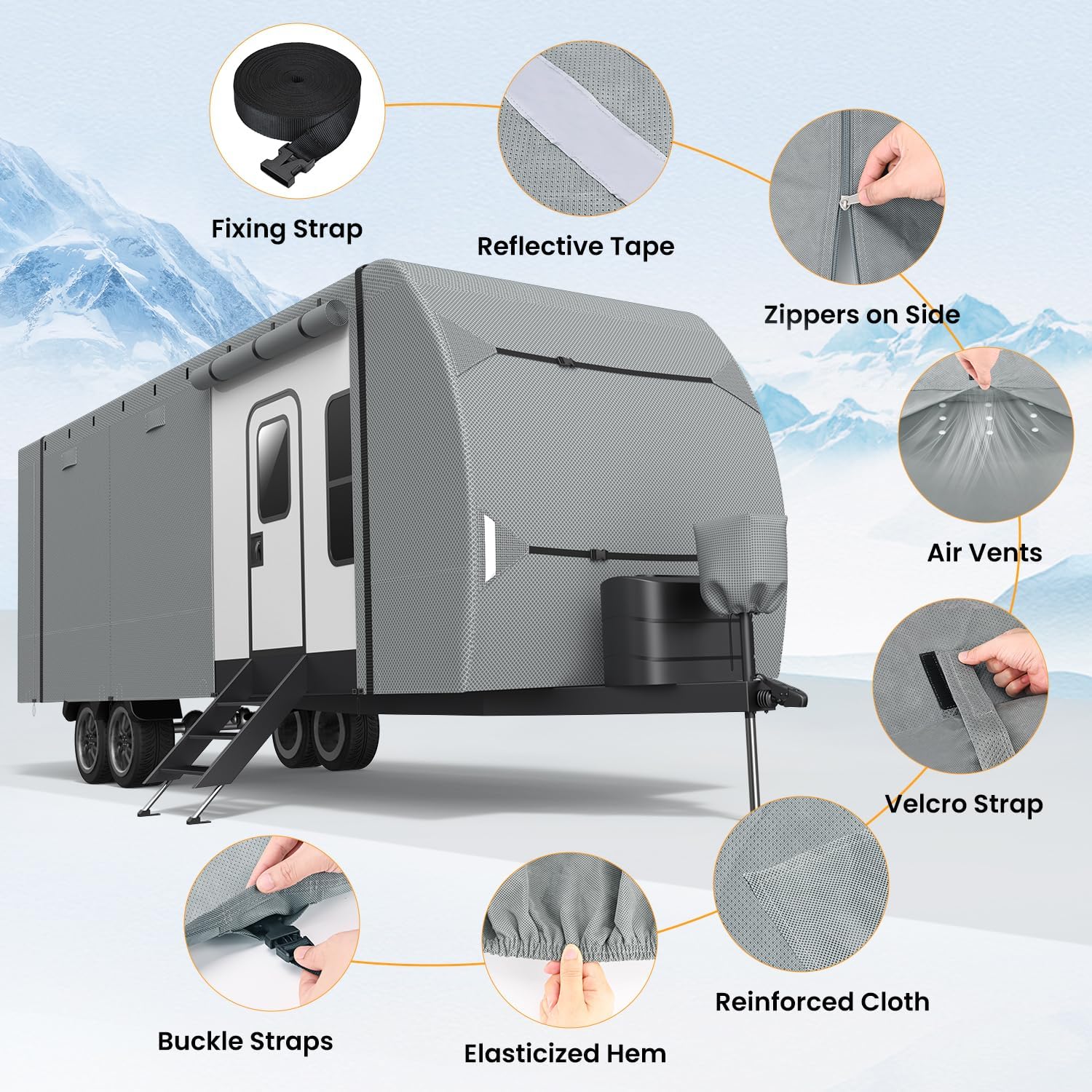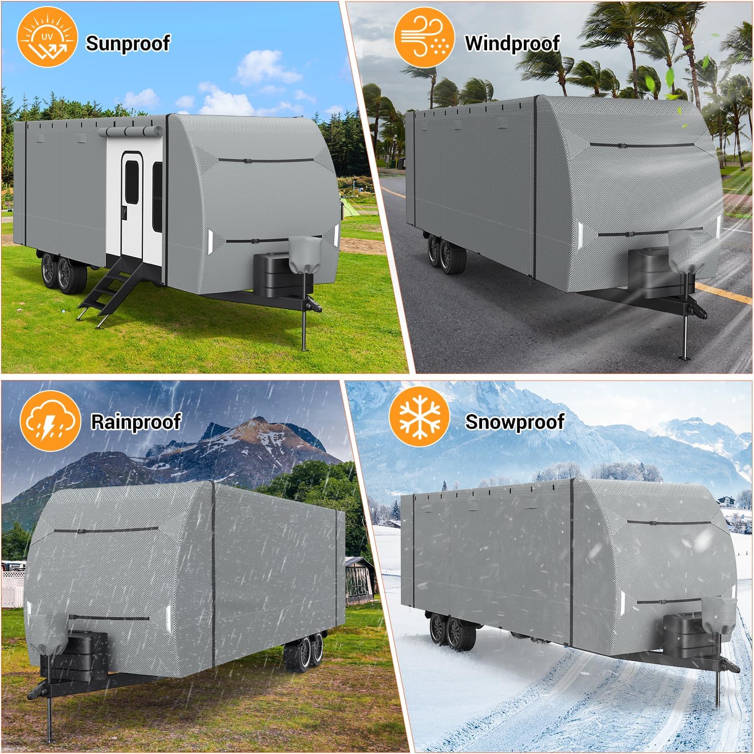 Anti-UV & Waterproof: Featuring a thick fabric with a built-in waterproof coating layer and anti-UV composition layer our camper cover prevents aging tearing and protects your RV from sun exposure rain snow and dust. Thickened corners solve the edges tearing problem.