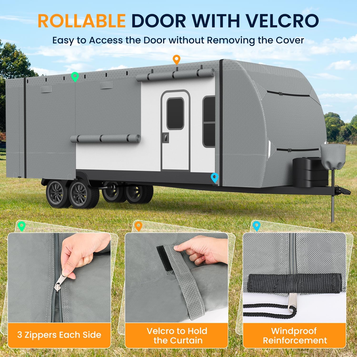 Upgraded Humanized Design: Travel trailer cover offers upgraded humanized design for ultimate convenience. Features include top handles for easy removal reflective strips for quick recognition at night elasticized hem for a better fit and a rollable door with velcro for convenient access without removing the cover. Enhance your RV life with cover!