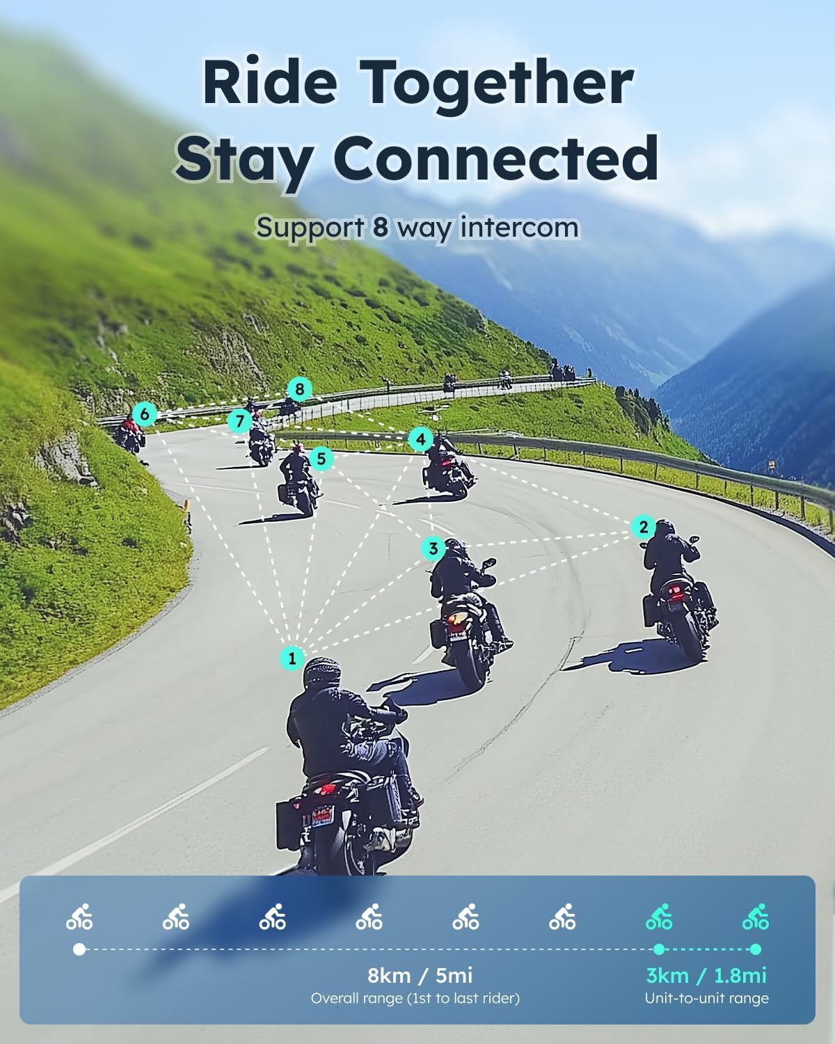 Voice ControlNo internet needed and no need to stop tap or look down just say Hi Max to change tracks adjust volume or start group intercom. One command instant action.Multi-Language SupportOffers multi-language voice prompts and offline voice commands giving riders worldwide a seamless language-friendly experience.FOTA Firmware UpdatesNever gets outdated. Update via the WORLD app to keep your device running at peak performance.Dual-Chip Bluetooth 5.4Dual-chip eight-core processing delivers faster smoother and more stable audio multitasking.40mm Drivers + Pro EQ40mm high-fidelity speakers with pro EQ tuning deliver rich immersive soundand you can personalize the audio in the WORLD App.ENC Noise ReductionCut through wind noise and stay perfectly audible even at 120km/h.Mesh IntercomConnects up to 8 riders with faster more stable and more reliable than traditional Bluetooth group intercoms.Communication DistanceOpen terrain: Up to 38 KM. Mountain roads/city areas: 12 KM. Stay connected even when your teammates are out of sight.Automatic ReconnectMoves back into range and instantly reconnectsno buttons no setup your team stays connected at all times.Universal PairingOne-button pairing with other brands. Simple. Fast. Hassle-free.Long-Ride BatteryA powerful 980mAh battery gives you 13 hours of intercom 16 hours of music and 96 hours on standby built to outlast your longest rides.60-Minute Fast ChargeFully charged in about an hour. Ready when you are.IPX7 WaterproofRain snow mud or water nothing stops it. No weather can hold back your ride.Con la app WORLD puedes personalizar tu dispositivo actualizar el firmware y ajustar las funciones de voz fcilmente.