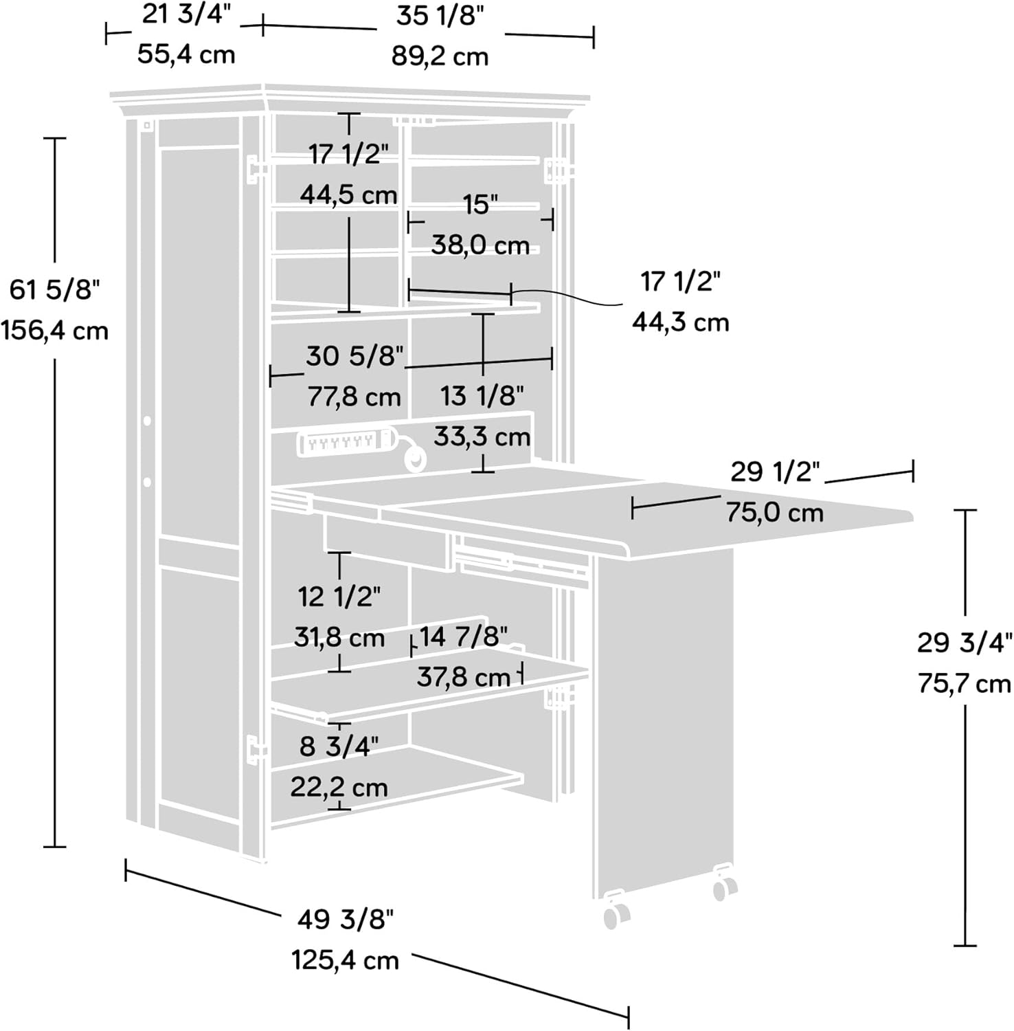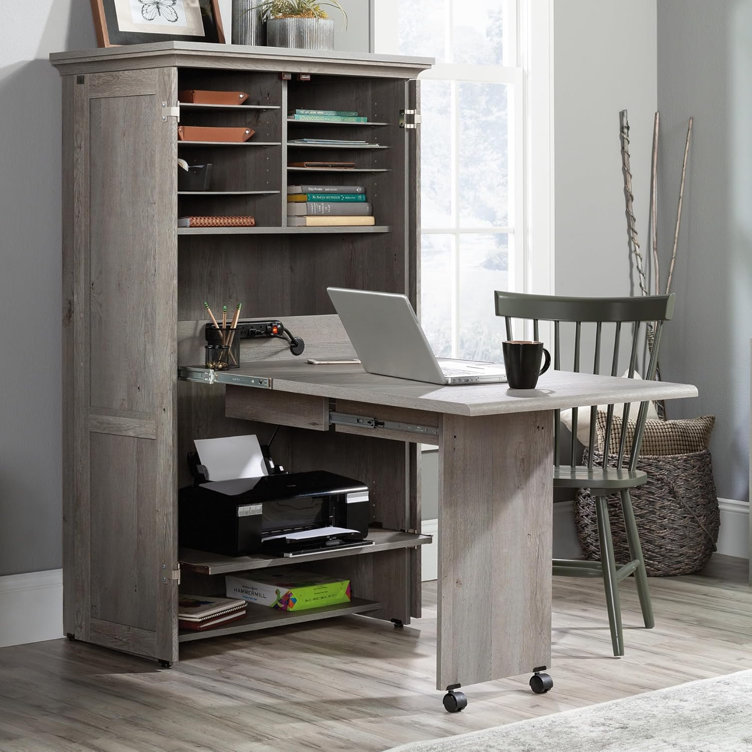 Maximize your space with the Craft & Sewing Armoire in Mystic Oak Finish your ultimate crafting or work-from-home station. This versatile piece offers functionality and style featuring a slide-out shelf with full extension slides and a drop leaf extension for an ample work surface. Imagine pulling up a chair plugged in and organized with a built-in power strip and six outlets crafting away or working on your latest project. Its sleek Mystic Oak Finish complements a range of dcor styles making it a seamless addition to both modern and traditional settings. With six adjustable shelves its easy to organize books textiles and more. This multifunctional armoire stores every tool and notion while keeping your space tidy. Picture it in your living room or home office simplifying and beautifying your life. Make the most of your square footage with the perfect blend of design and utility.
