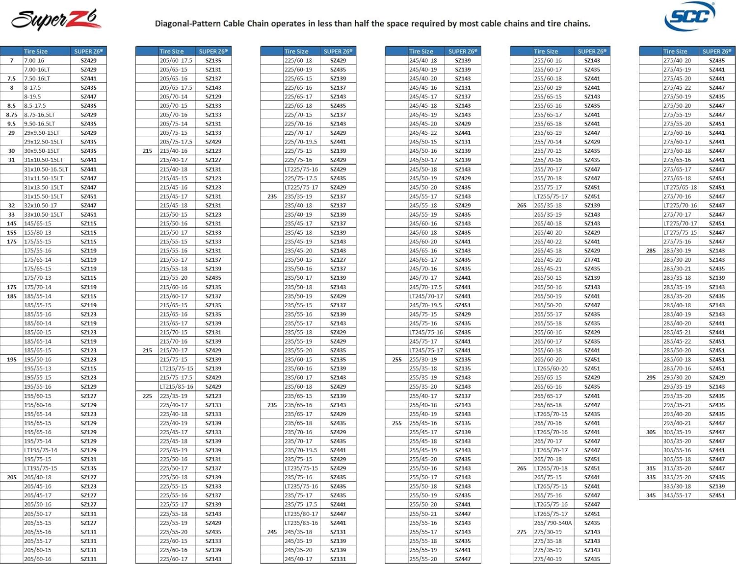 The Super Z6 is available to fit pickups and SUV tire sizes. It offers a unique combination of performance and convenience features for every user including a "designed-in" rubber tightener better all-around traction performance than conventional tire chains or cables and greater durability.