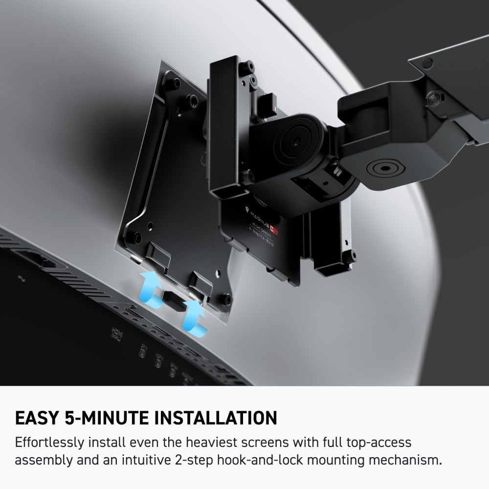 A 2-step hook-and-lock design makes mounting even the largest monitors a breeze. Top screw C-clamp mount allows for quick hassle-free adjustments in clamping position.