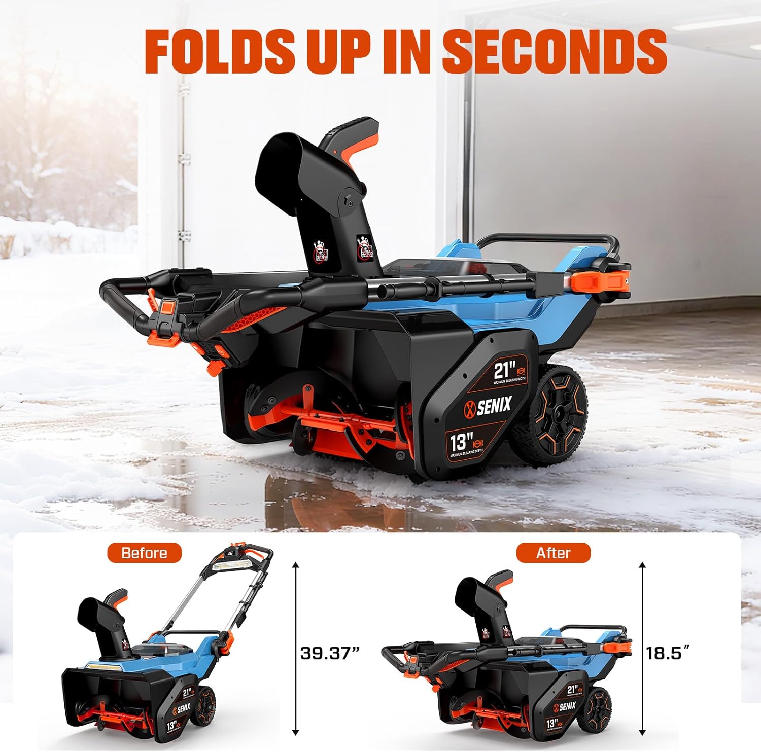 ELECTRONIC ADJUSTABLE CHUTE: Rotate the chute up to 200 for precise snow placement with the push of a button for maximum efficiency and convenience; 8" all-terrain wheels ensure smooth transport and maneuverability across snow-covered or uneven surfaces