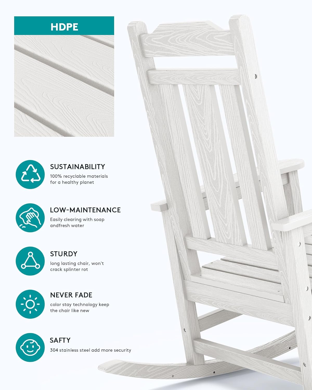 Indoor & Outdoor UseThis HDPE rocking chair with wood texture is more stylish which can be used indoor and outdoor will complete your living room or outdoor patio.