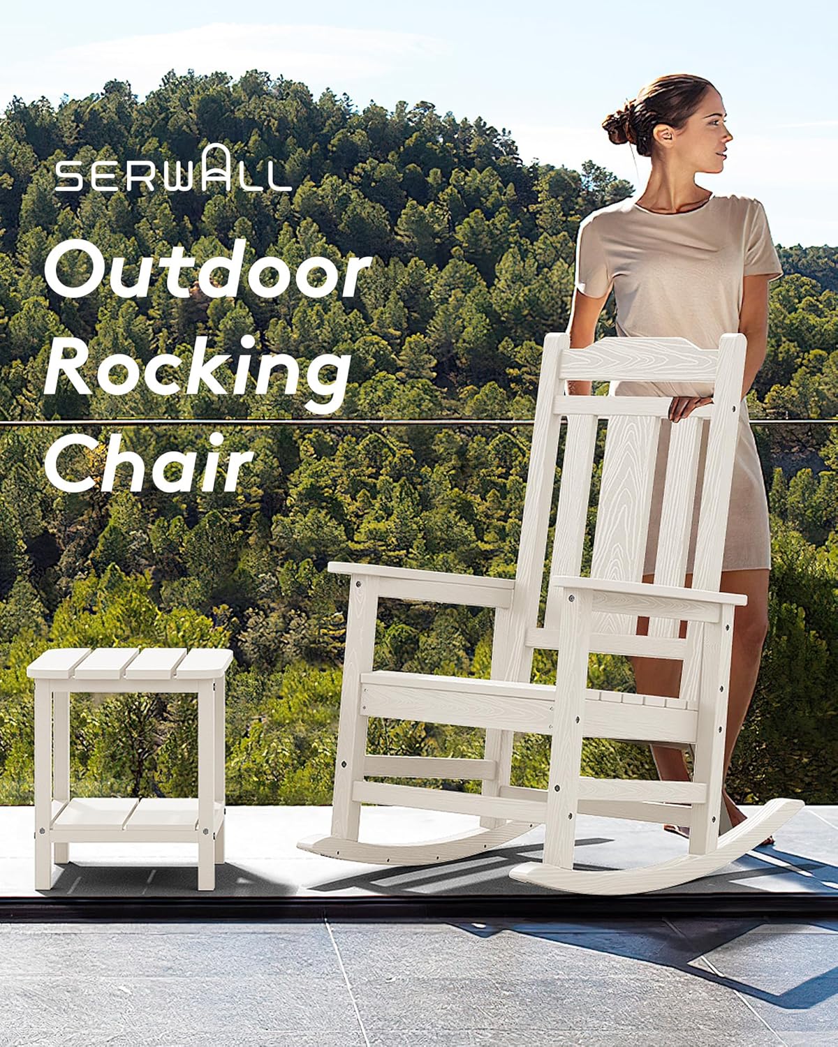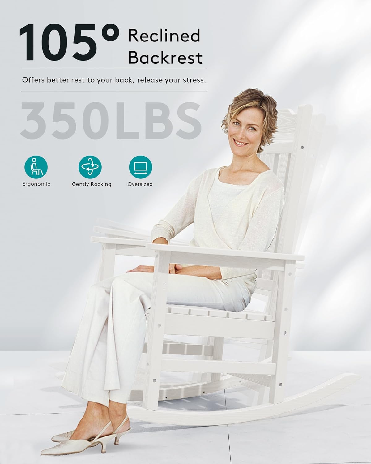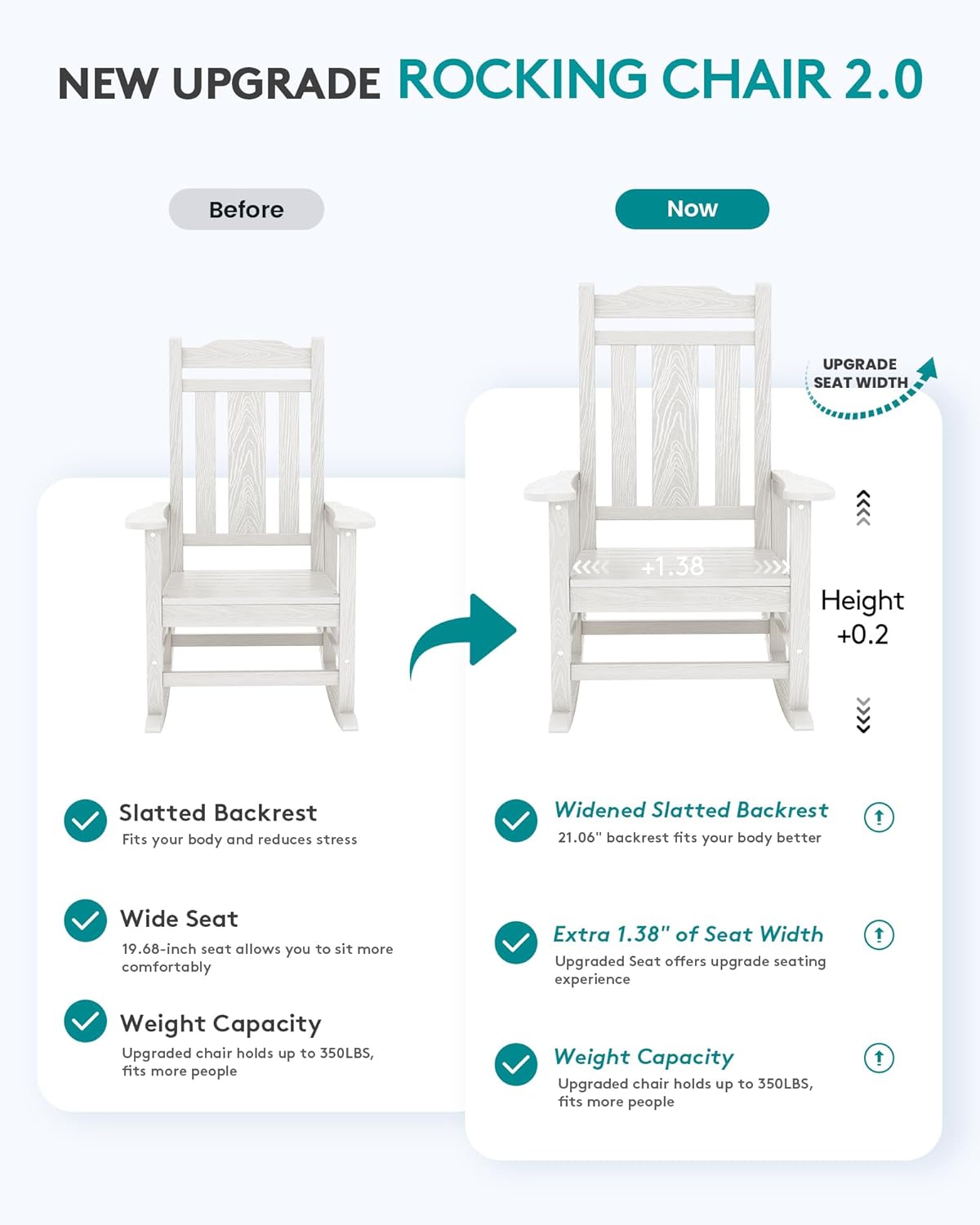 Extra Wide Outdoor RockerMeasuring with 35"D x 26.9"W x 41.3"H our heavy duty rocking chair can hold up to 350LBS. The seat width is 21.1" ensures the comfortable seating experience. The chair weights 38.3LBS which is heavy enough to prevent blowing.