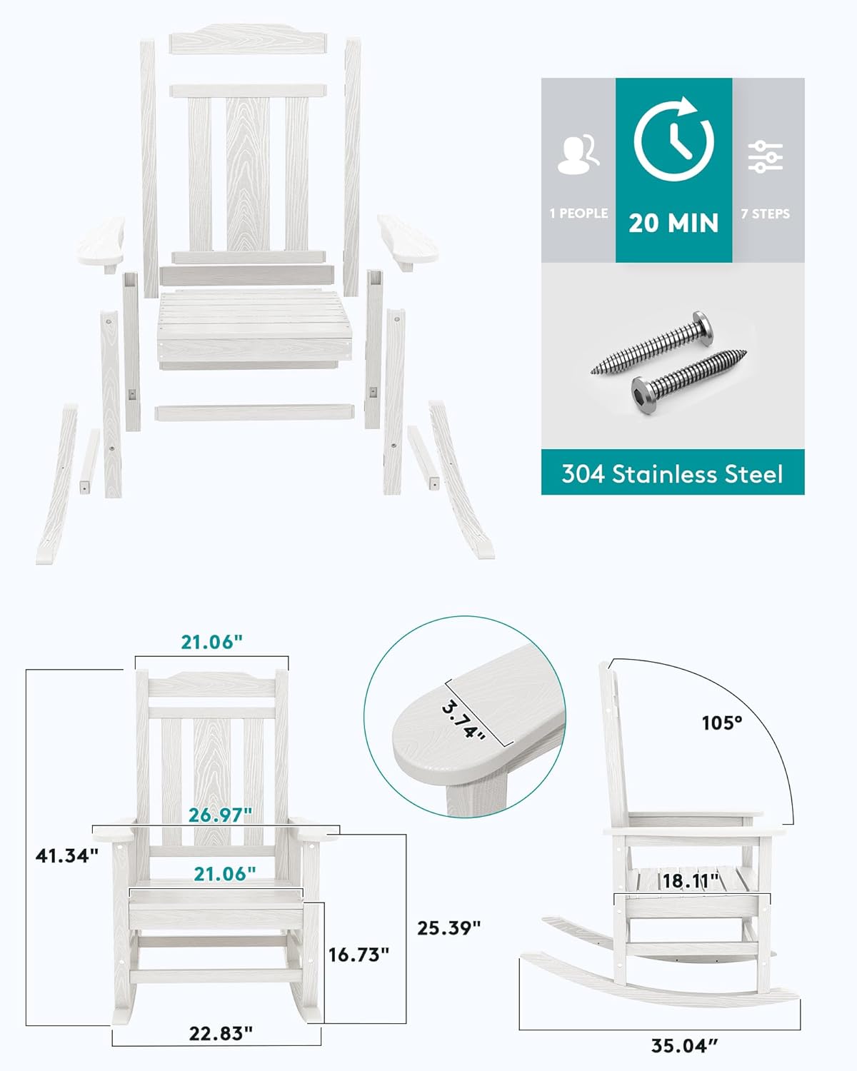 30-Mins InstallationPartial installation required. Making your patio rocking chair in 30 MINS. Coming with hardware set and instruction the installation will be a simple process. Instructional video is provided on our website. (ATTN: Do Not Screw The Screws Tightly Before Finishing).