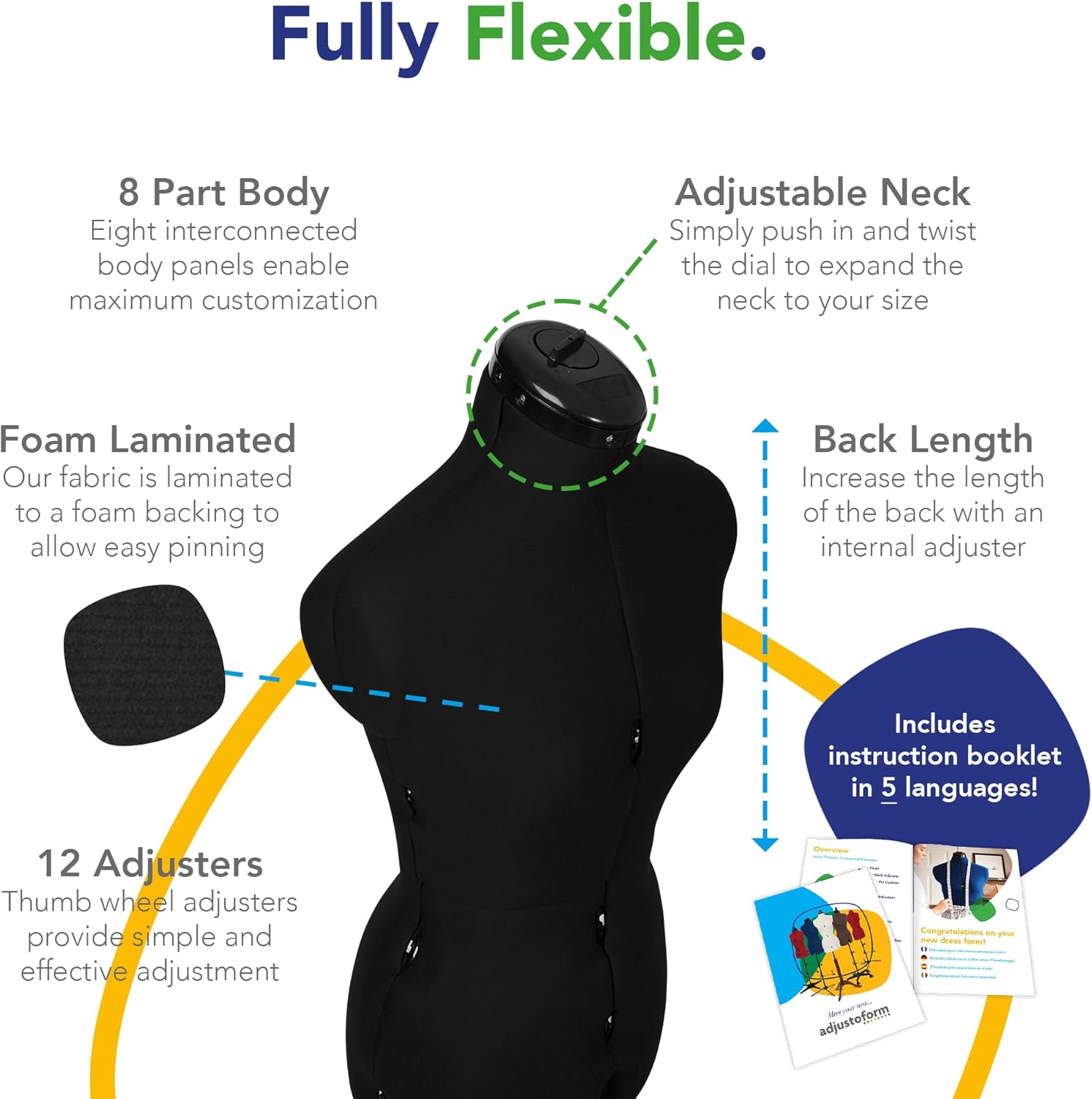 Features a medium length adjustable body with 12 thumb wheel adjusters at the bust waist & hips. Also allows adjustment to the height neck and back length