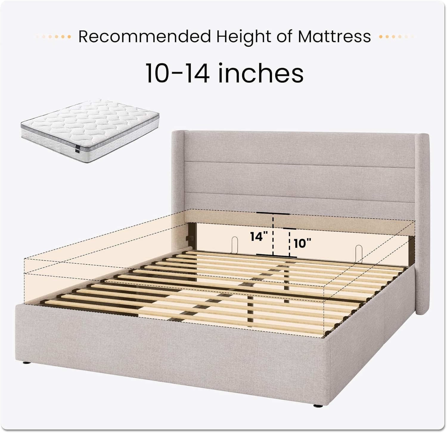 Lifting Mechanism Design: With hydraulic lifting mechanism, you are able to pop up the platform effortlessly. No worries about the mattress sliding with the protective device back the frame
