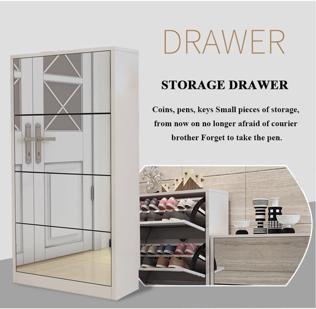 ? High Quality Shoe Rack: The slim shoe cabinet is made of high-quality MHkcvvF in white lacquer. The mirror is very thick and not easy to break. The frame of the mirror has been polished and will not scratch you.