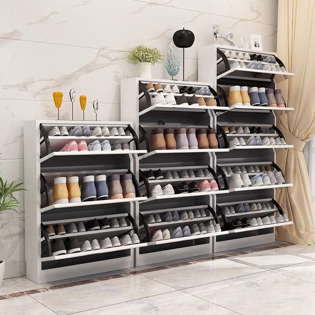 ? Entryway Shoe Cabinet: The tipping shoe cabinet can hold up to 17/24 pairs of shoes (When the shoes are stacked up and down) Anti-toppling design is safer and the bottom mat prevents your floor from scratching.