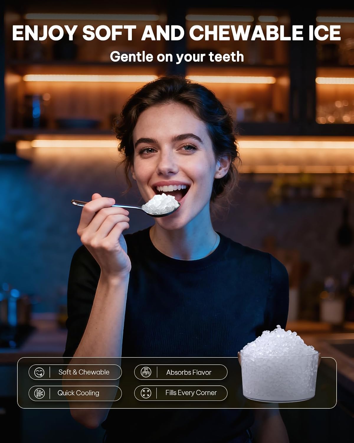 Rapid Pebble & Crushed Ice Production: pebble ice maker creates soft chewable ice cubes in 10 minutes and produces 44lbs/24h of crushed ice - ideal for smooth texture lovers. The upgraded compressor ensures continuous output for parties/offices without flavor dilution