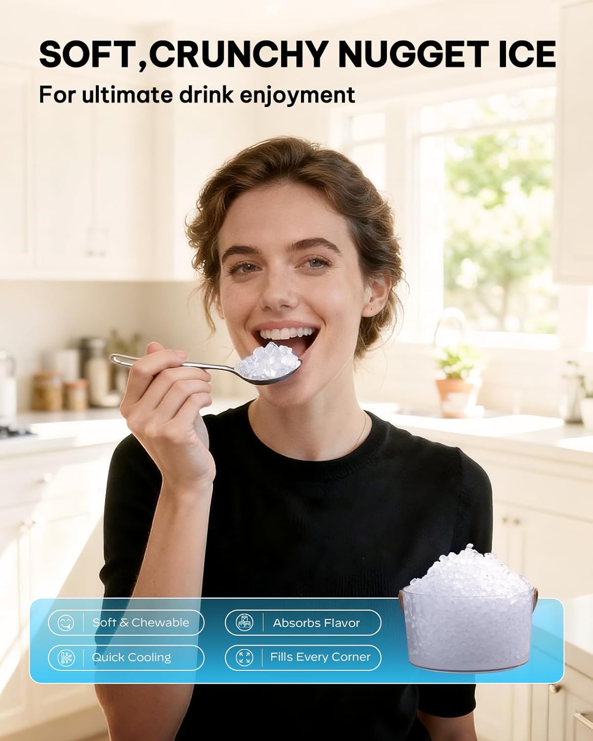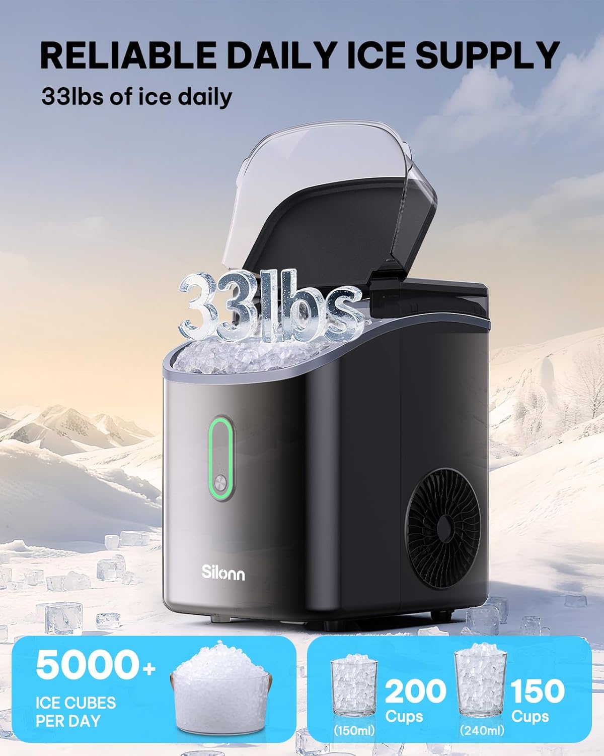 Efficient Ice-Making: With a daily output of 33 pounds this pellet ice maker machine meets the demands of large households and entertaining events. Prepare your favorite drinks instantly with freshly made nugget ice available in as little as 6 minutes.