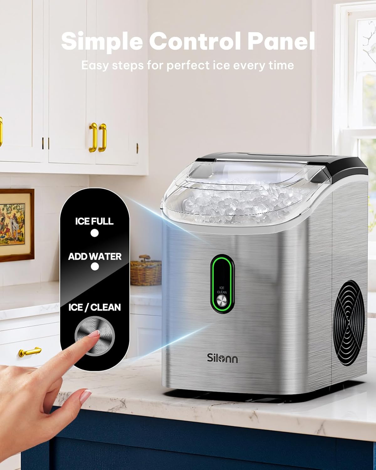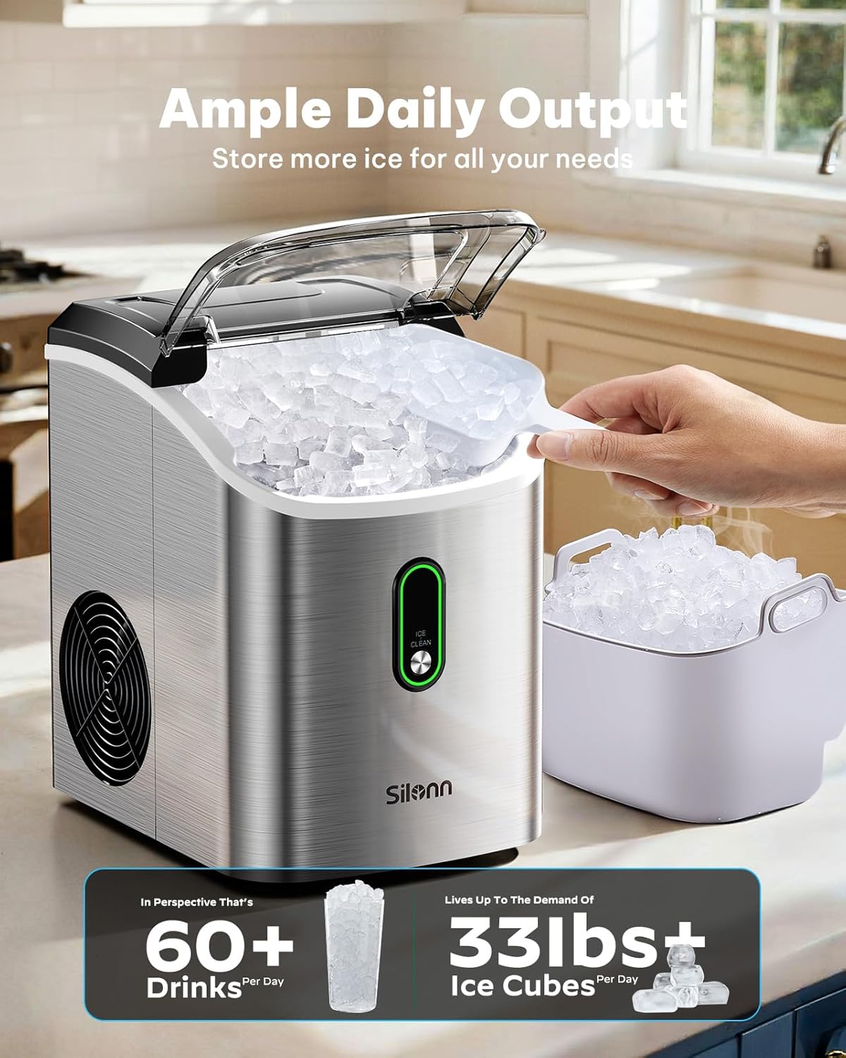 Whisper-Quiet Operation: Experience the tranquility of our nugget ice maker countertop engineered for a quiet cooling process making it one of the most silent models on the market. Enjoy seamless ice production without disturbing your home or office environment. Plus an indicator light conveniently alerts you when water levels are low or the ice basket is full
