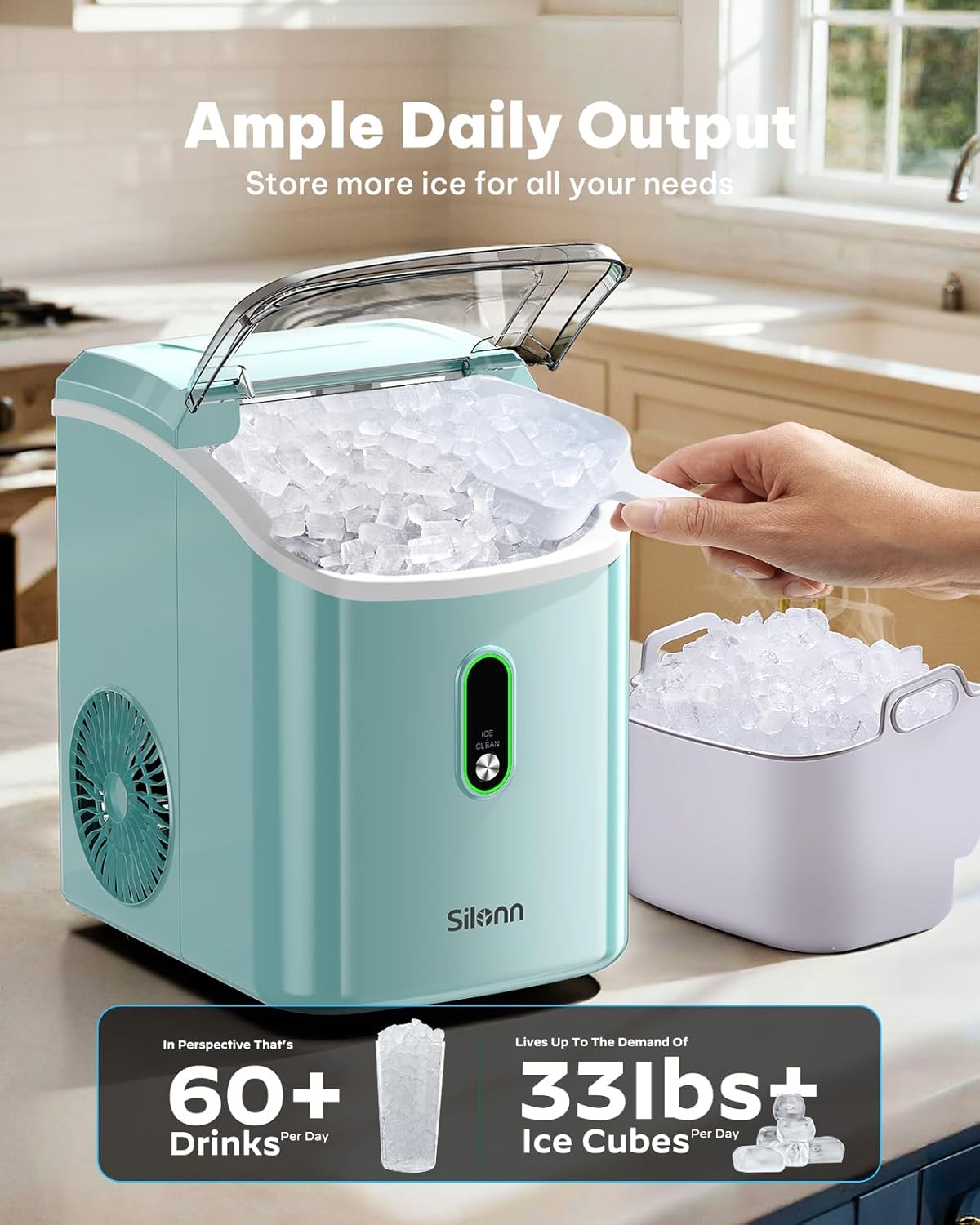 • Nugget Ice Maker Countertop Pellet Ice Machine with Self-Cleaning Function Sonic Ice Maker Produces 33lbs of Chewable Ice in 24 Hours Ideal for Home Kitchen and Office (Green)