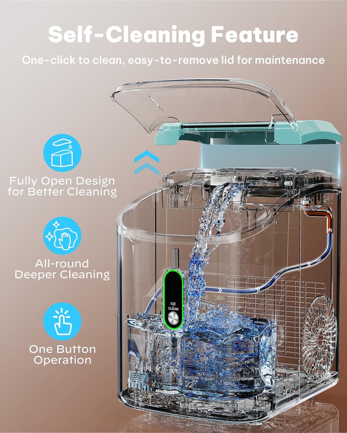 Effortless Self-Cleaning: The countertop ice maker features a convenient removable cover allowing you to easily access every corner for thorough cleaning. Plus it includes an automatic self-cleaning cycle that can be activated with a simple press and hold of the ICE/CLEAN button for 5 seconds ensuring hassle-free maintenance and hygiene