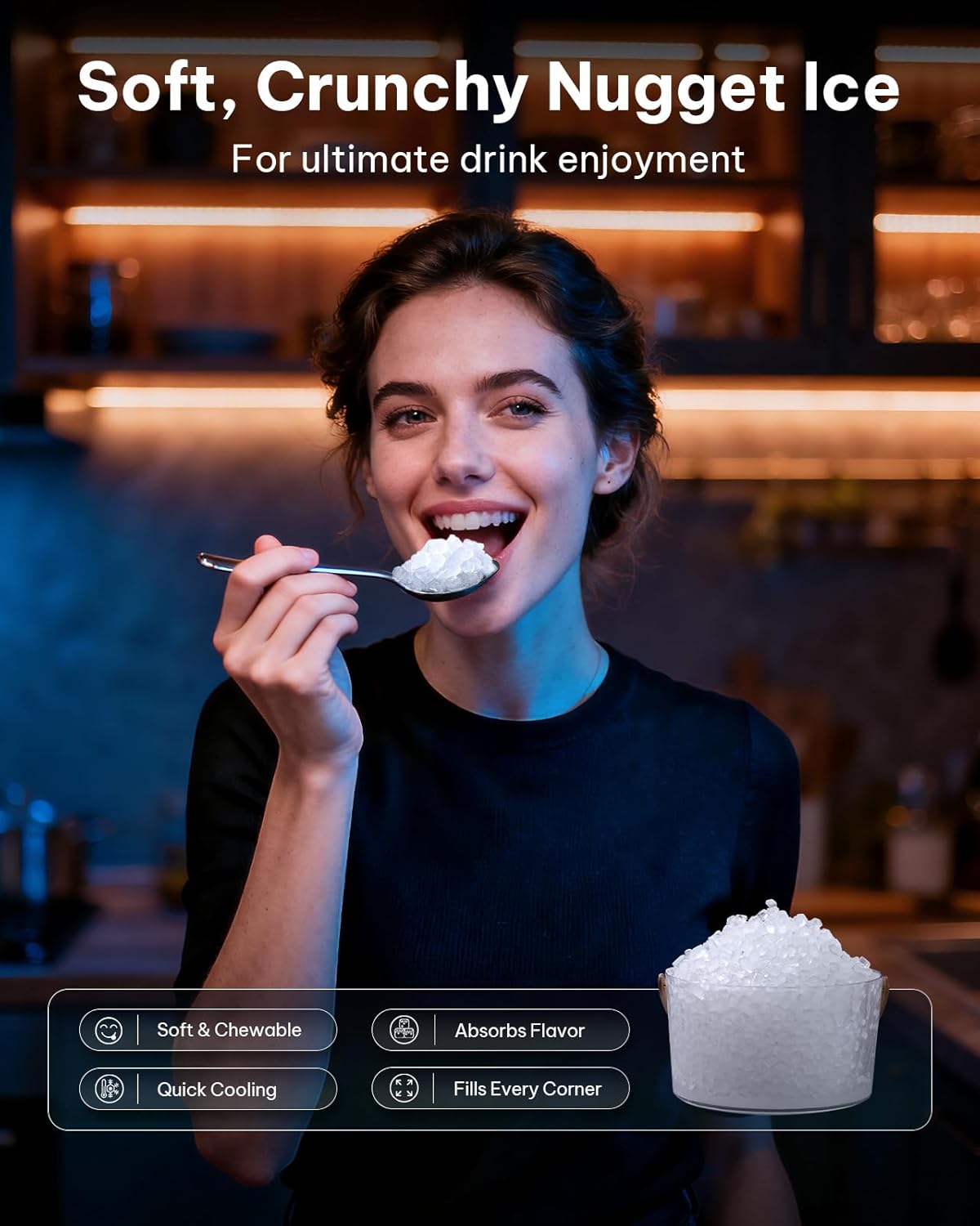 Soft Chewable Ice Youll Love: Our ice machine produces enjoyable crunchy nugget ice thats gentle on your teeth. Its perfect for cooling your drinks and enhancing their flavor like cocktails lemonade soda iced coffee and more. Its also an excellent way to keep seafood cool and fresh.