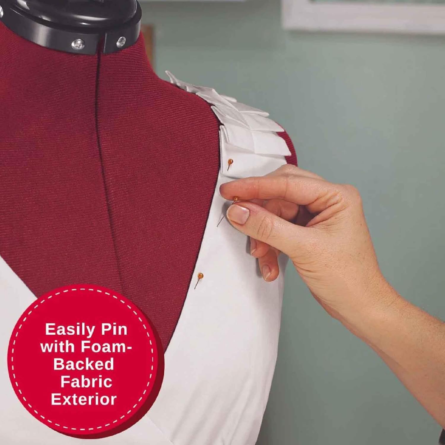 This dress form is perfect for precision sewing or even a display piece! The dress form's 12 dials allow you to find the perfect fit in seconds. The Foam-Backed Fabric Exterior allows you to easily pin dresses skirts tops and patterns. The easy tool-free Height Adjustment lets you customize the dress form to your height in a snap. Enjoy absolute accuracy with the easy-basting Hem Gauge.