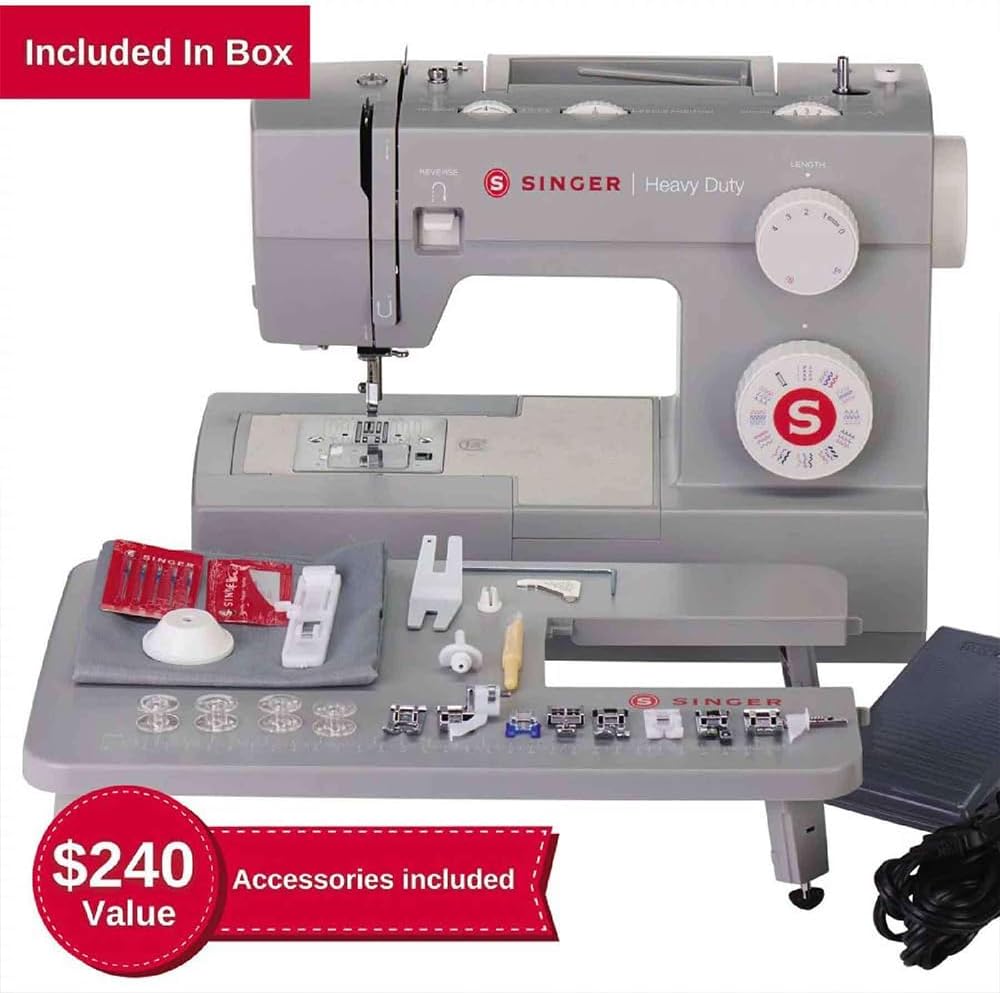 INCLUDED ACCESSORIES: Features an extension table non-stick foot clearance plate heavy-duty needles all-purpose foot zipper foot buttonhole foot button sewing foot sew easy foot overcasting foot blind hem foot straight stitch foot 4 bobbins spool holder spool pin felt screwdriver seam ripper and soft cover.