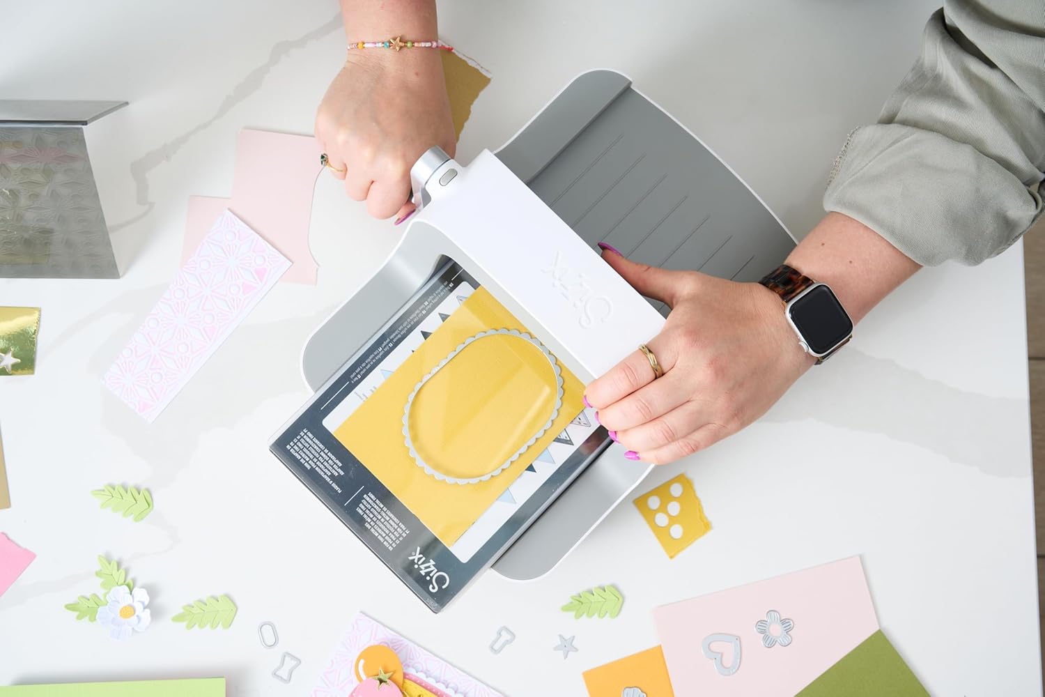 The Big Shot you know and love just got a fabulous redesign and it's ready to take center stage! For the first time since it's debut in 2001 the body of the iconic Big Shot is unveiling a sleek modern and stylish new look. With the same rock-solid trusted performance that crafters have depended on for over two decades the machine has been desgined to fit beautifully into any creative space. It's more than a tool it's a statement piece! Featuring a clip on handle which can be stored underneath the machine it's compact to fit in even the smallest of craft rooms. The ergonomic carry handle means you can even take it with you perfect for crafty events. Even the included starter kit has had a revamp! Newly added alphabet dies allow you to create for any and all occasions throughout the year with ease. We've also reduced the cardstock size down from A4 with the smaller size making it even more convenient to roll through your machine. It's still the versatile die-cutting powerhouse you love able to handle a wide range of die-cutting and embossing technologies from cardmaking and scrapbooking to larger papercraft and home decor projects.