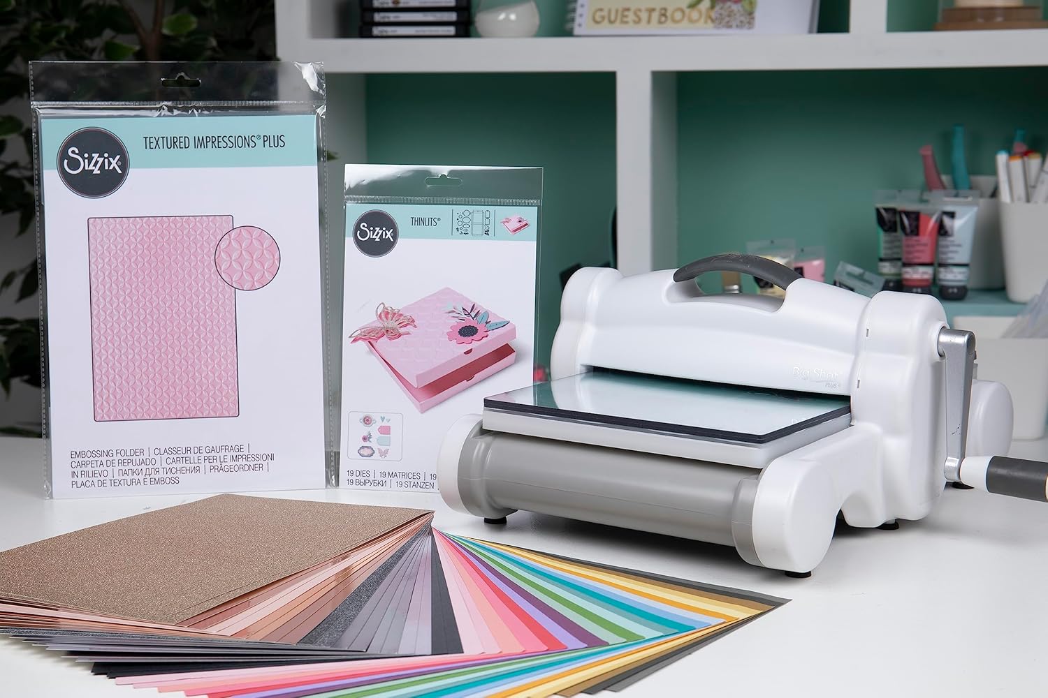 INCLUDES - 1 Big Shot Plus Machine 1 Pair Of Cutting Pads 1 Standard Platform 1 Thin Die Adapter 1 19PK Thinlits Dies 1 Plus Embossing Folder 20 Cardstock Sheets (20 Colours) 20 Opulent Cardstock Sheets in Rose Gold and Charcoal