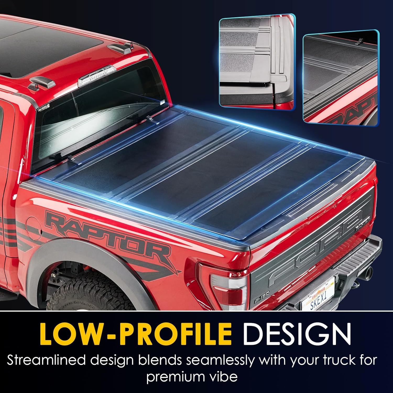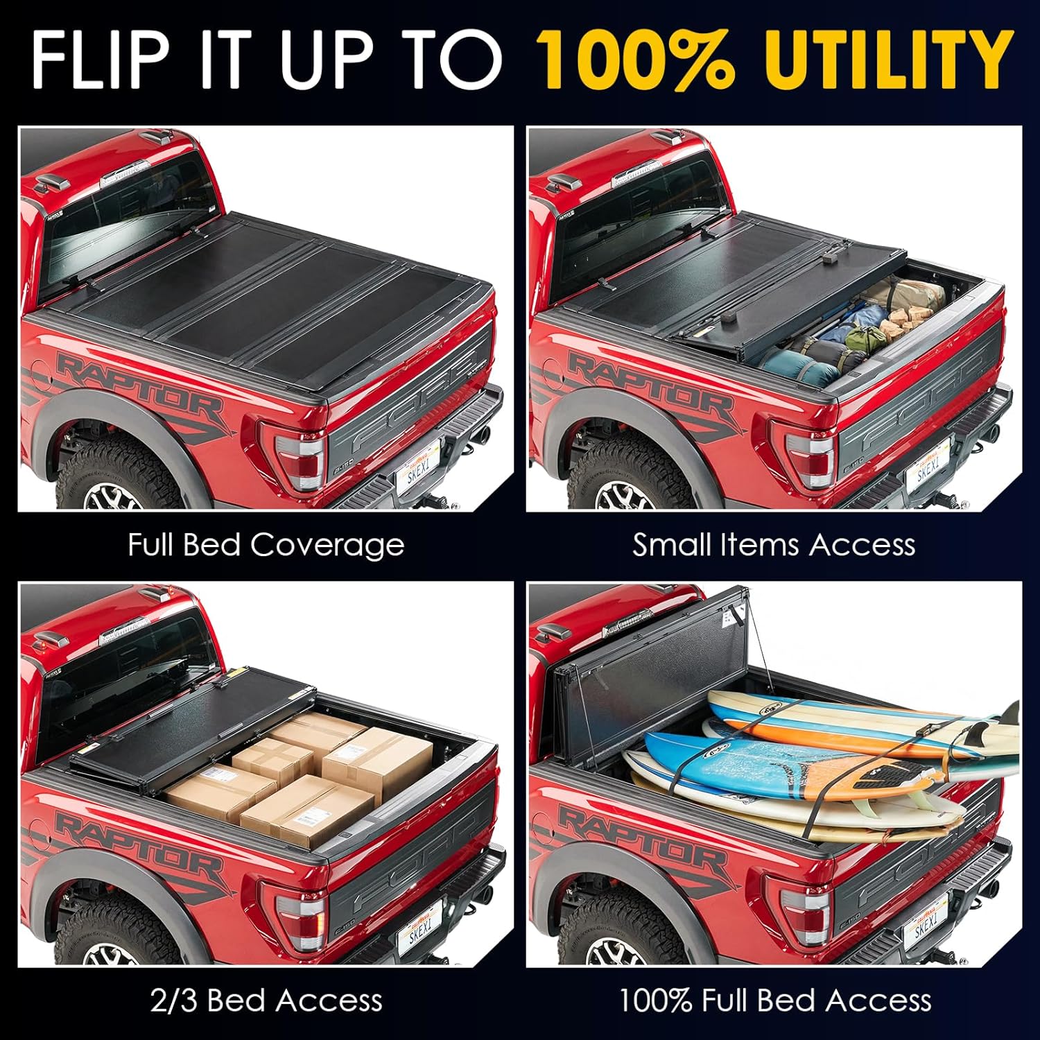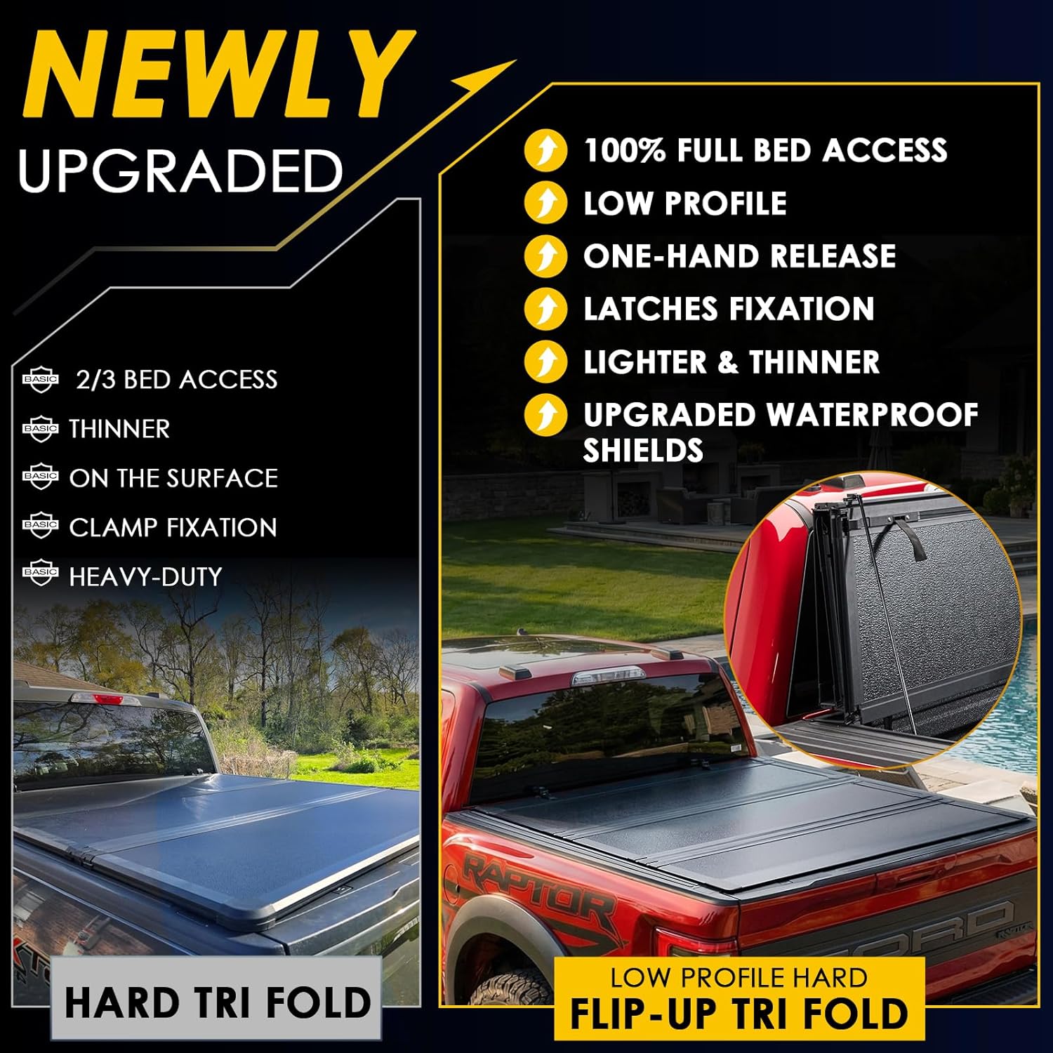 US Patented Full-Fold Design 100% Full Bed Access: US Design Patented flip-fold mechanism easy to roll up and vertically stacks compactly. Maximizes bed accessibility enables full-height cargo loading without cover removal (better than conventional tri-folds) low-profile design eliminates highway wind noise and resistance to help improve fuel efficiency on the highway