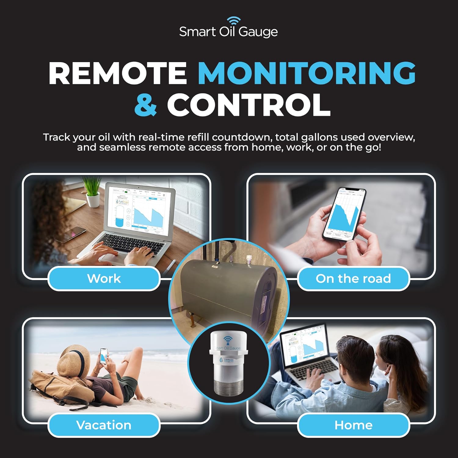 STAY AHEAD WITH LOW-LEVEL ALERTS: Smart Oil Gauge the leading wifi fuel oil tank gauge ensures you're always informed. Receive timely text and email alerts with the Smart Oil Gauge when your tank hits critical levels. Be notified when the oil level sensor is at 1/3 1/4 and 1/8 oil tank capacities. Eliminate those midnight oil runout worries!