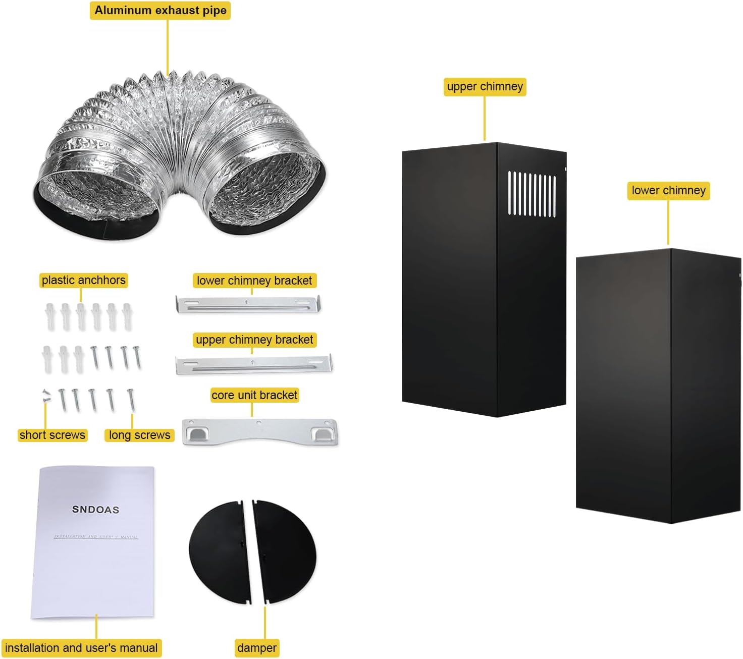 3-year Limited Parts:Black painted stainless steel stove vent hood comes with hardware instructions duct pipe air backdraft damper and chimney flue duct covers. 120V/60Hz 3-prong plug. Please install the range hood according to the product manual and please feel free to contact us if you need any assistance.
