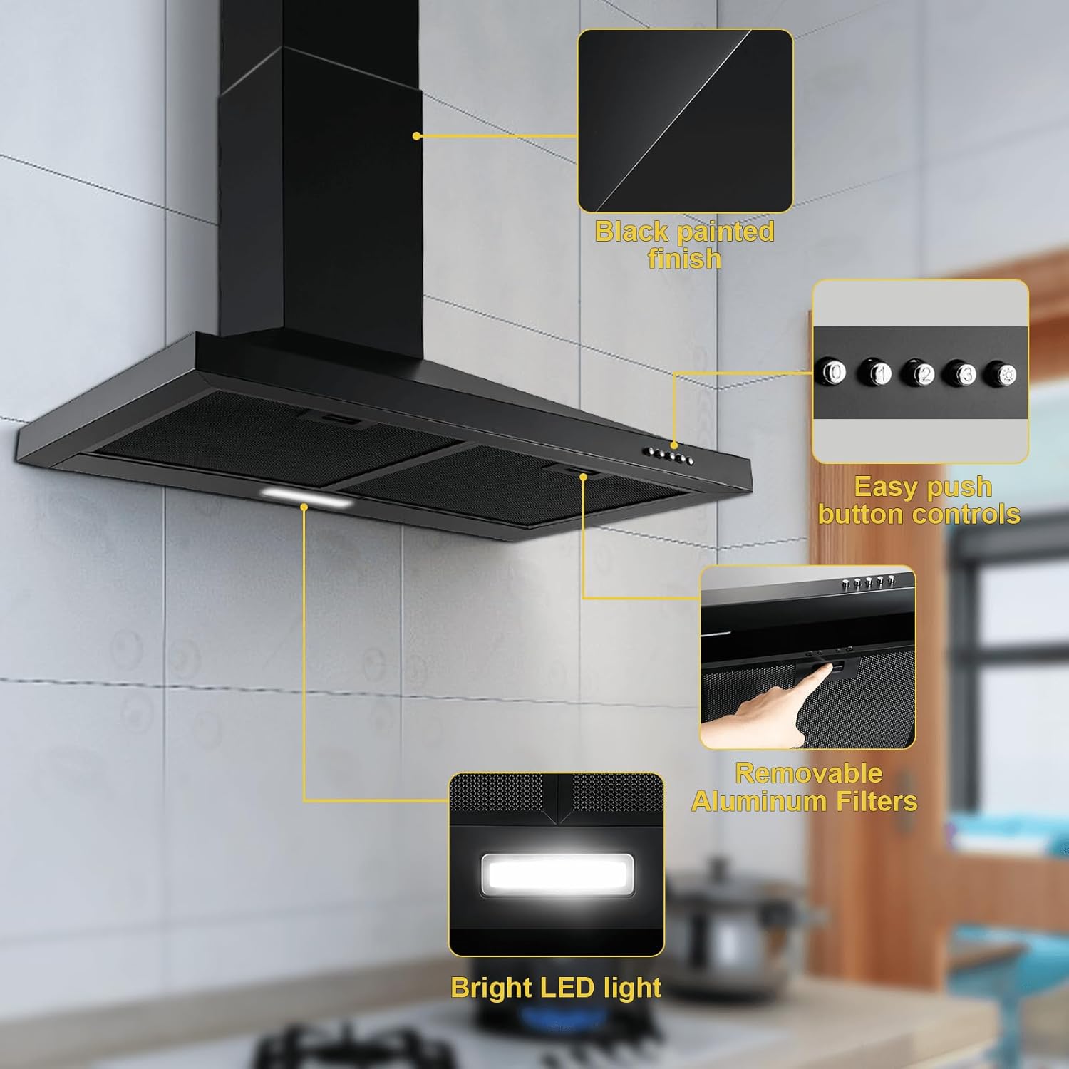 Luxury stainless steel body that painted matte black match with black aluminum grease filters highlight your kitchen structure. Powerful but also elegant home appliance can keep your family stay health without smoke and odors disturb.