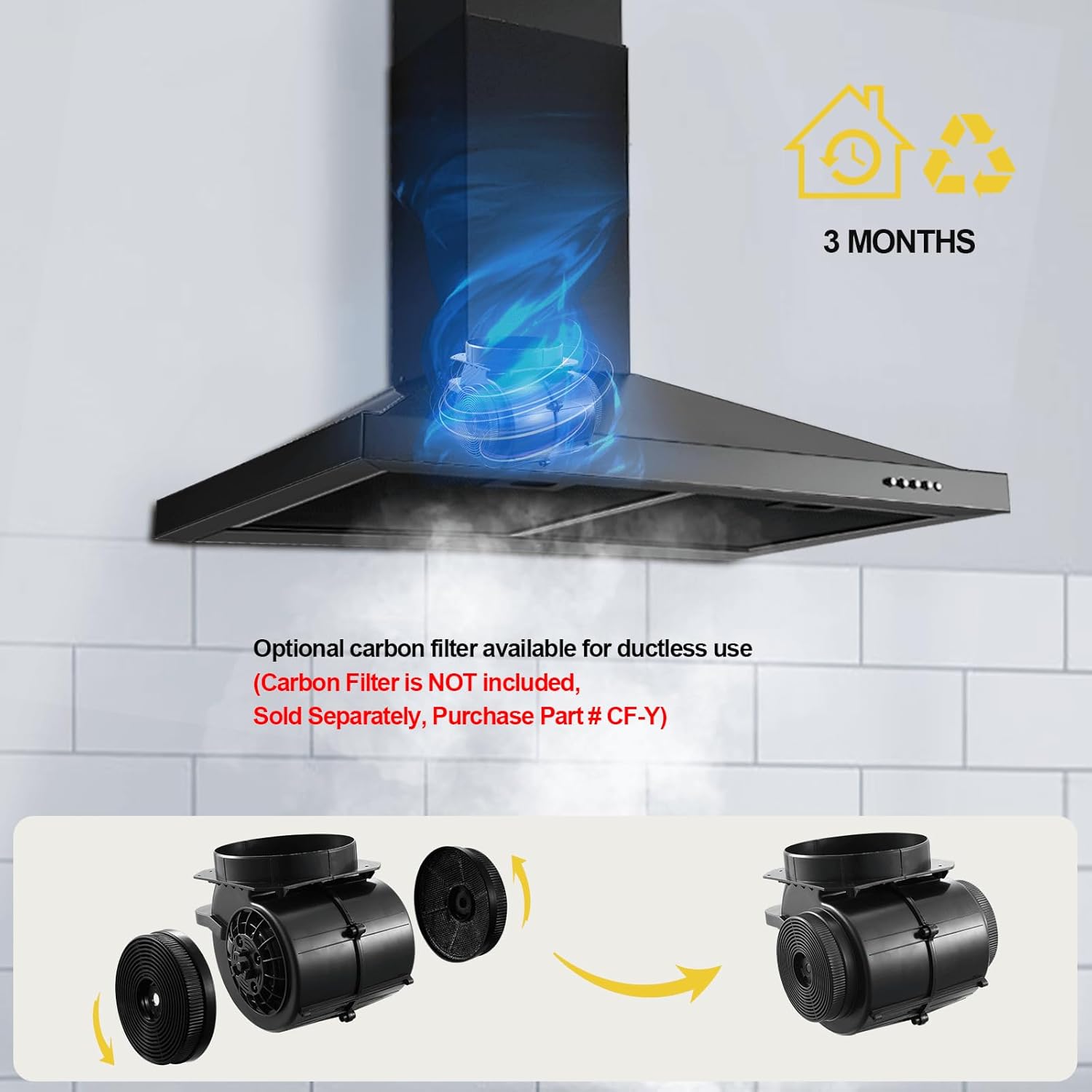 Ducted / Ductless Convertible Kitchen Hood Vent:This kitchen hood has a 6 inch round top vent and comes with a 6.5ft aluminum exhaust pipe can be vented outside. Optional carbon filter kit for ductless use(Carbon Filter kit is NOT included Sold Separately Purchase Part # CF-Y).