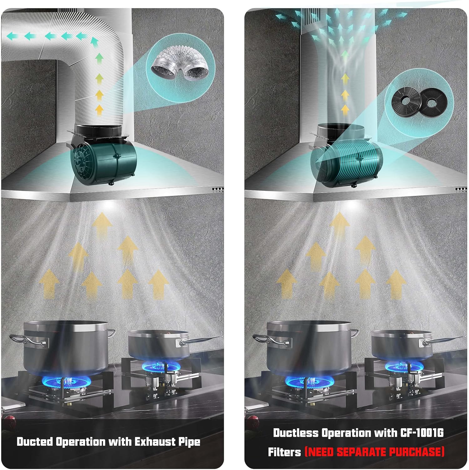 Efficient Airflow Kitchen HoodMax 450 CFM suction removes smells and odors with ease for a clean kitchen.This kitchen hood has two modes venting option it has a 6 inch round top vent and comes with a 6.5ft aluminum exhaust pipe can be vented outside. Optional carbon filter kit to convert your range hood to ductless(Sold Separately Purchase Part # CF-1001G).