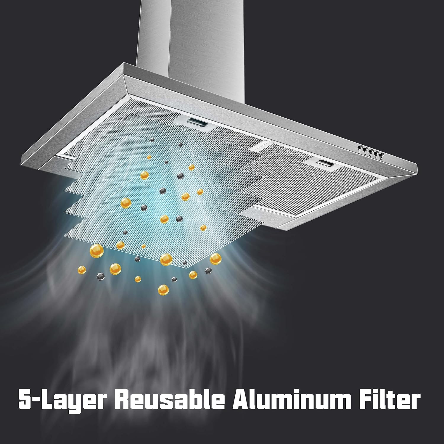 Multi-layer Aluminum Mesh FiltersThe hood vent comes with 2 permanent aluminum filters effectively removes smoke and odors.5-layer filters are removable and reusable pretty easy to clean up and cost savings.
