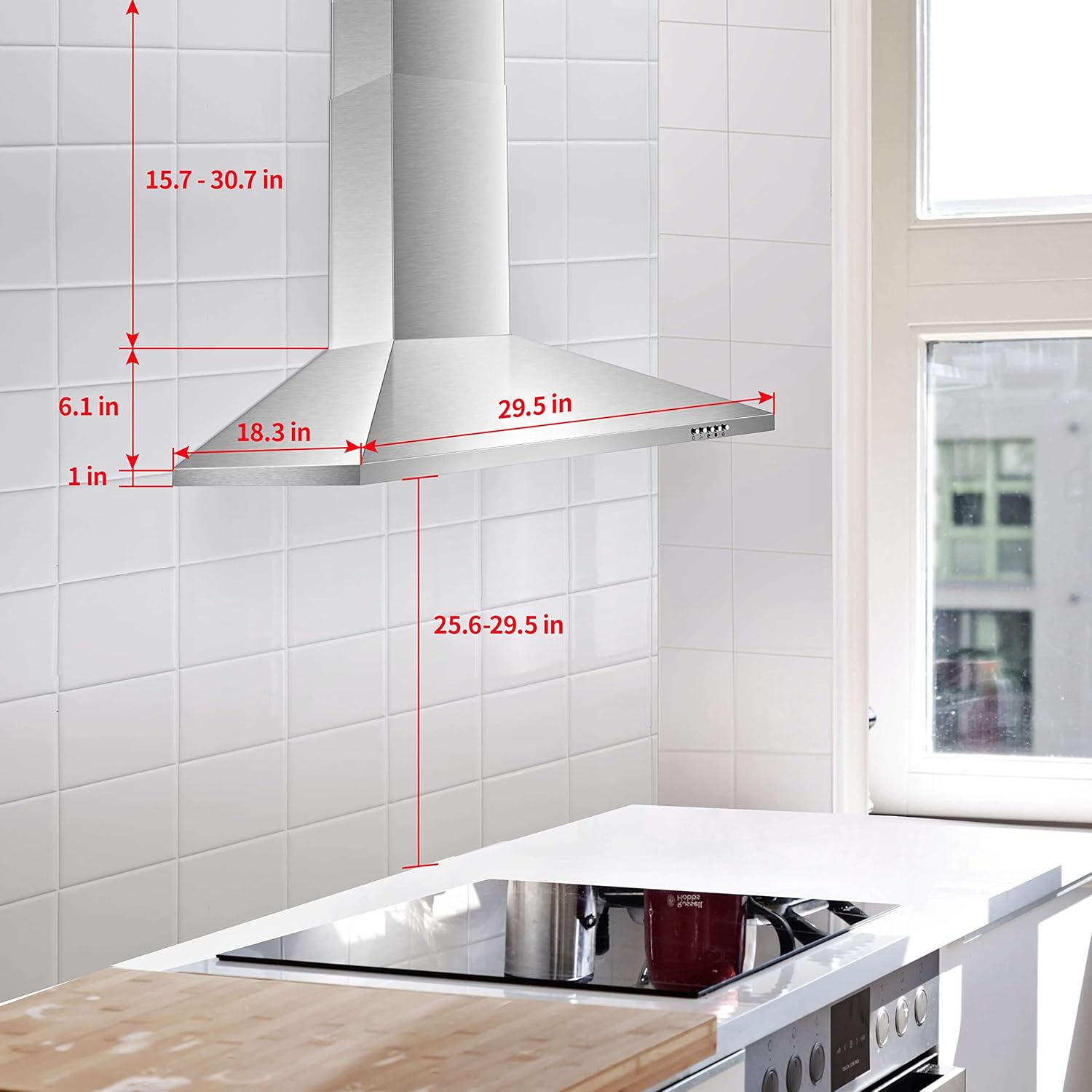 Made of Premium 430 grade brushed stainless steel classical pyramidal hood fits most kitchen decors. range hood makes your life easier brighten up your kitchen and protect your health!