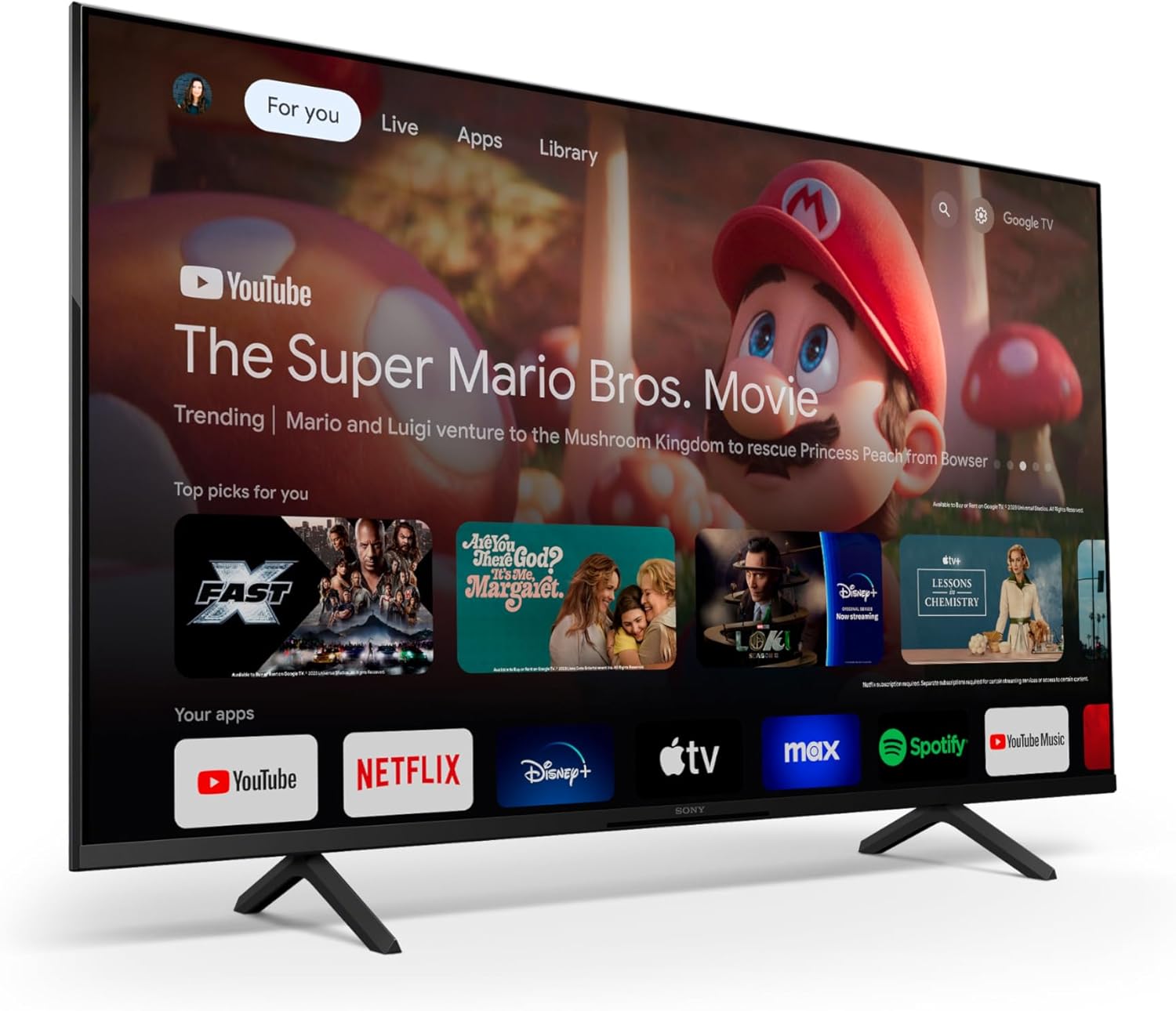 Intelligent TV processing 4K HDR Processor X1 intelligently enhances every scene in real-time boosting color contrast and clarity. Real-world colors With Triluminos Pro see over a billion accurate colors for lifelike picture quality that is vivid and bright. Everything you stream. All on one screen Get access to all your favorite streaming apps in one place with Google TV. And with Google Assistant simply use your voice to search and ask questions. Your favorite streaming apps in one place Get access to all your favorite streaming apps including Netflix Prime Video Disney+ YouTube the Apple TV app Crunchyroll and many more. Effortlessly stream to your TV Easily stream to your TV with support for AirPlay 2 and Chromecast built-in. Movies included with BRAVIA TV Enjoy streaming high-bitrate high-quality 4K UHD movies included with the SONY PICTURES CORE app (formerly BRAVIA CORE). Get 5 credits to redeem on latest release movies and 12 months subscription on hundreds of classics. More immersive movie experience Get a truly cinematic viewing experience with support for4K HDR Dolby Vision and Dolby Atmos. Upscale everything you watch Bring back lost detail and see your content upscaled to near-4K resolution with 4K X-Reality PRO. Smooth and clear action See blur-free picture quality in fast-moving sports and movies powered by Motionflow XR technology. Big sound with complete clarity Our innovative X-Balanced Speaker and support for Dolby Atmos provides clear natural sound for all your favorite content. Perfectly pairs with Sony soundbars Pair BRAVIA TV with compatible Sony soundbars for the ultimate cinema-like experience at home. Features for PlayStation 5 Take your PS5 gaming to the next level with exclusive features Auto HDR Tone Mapping and Auto Genre Picture Mode that optimizes picture quality for gaming and streaming. All your game settings in one place Game Menu puts all your gaming picture settings and exclusive assist features in