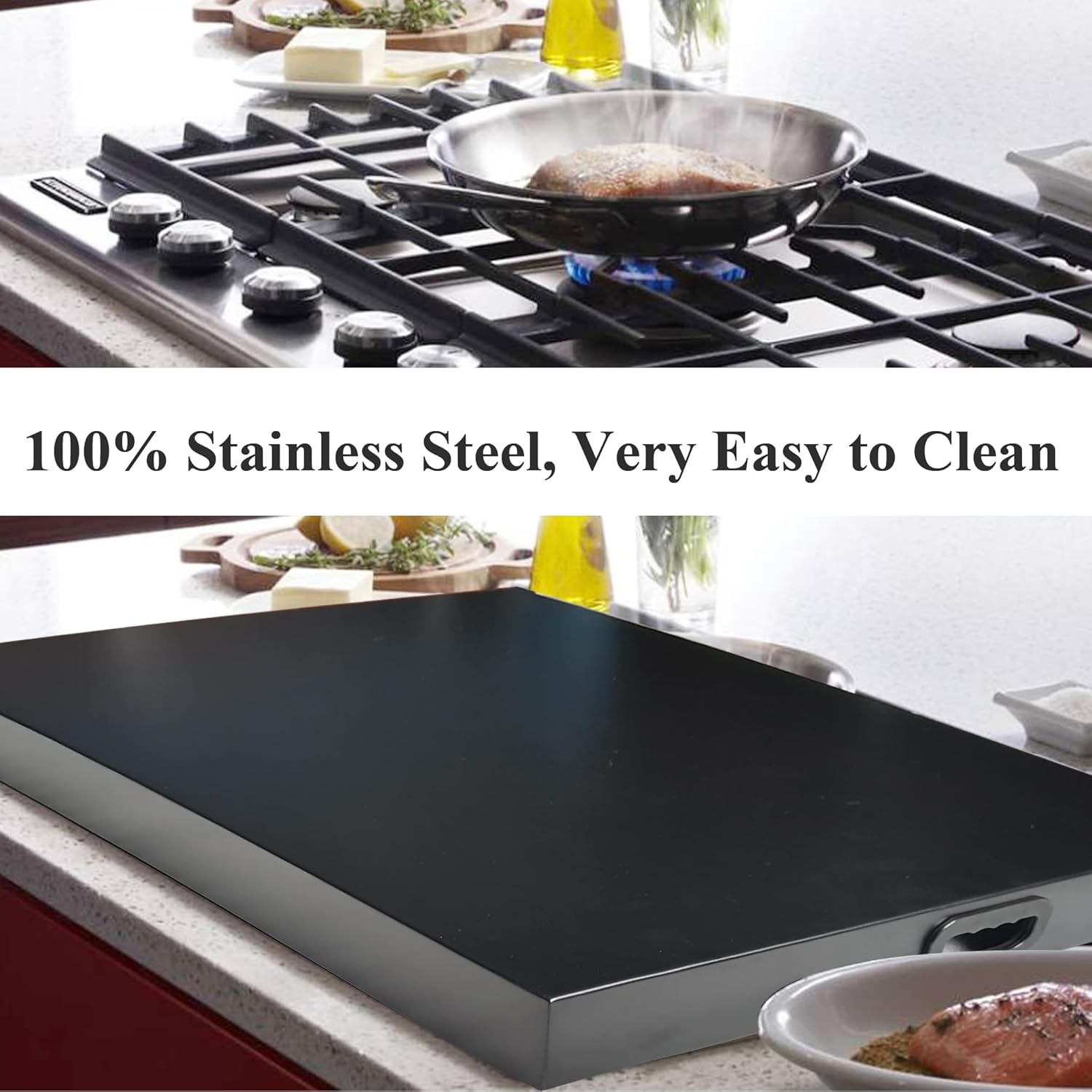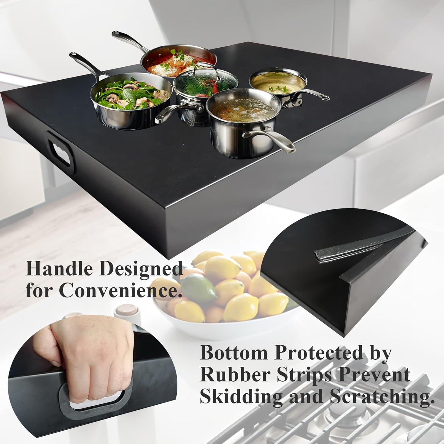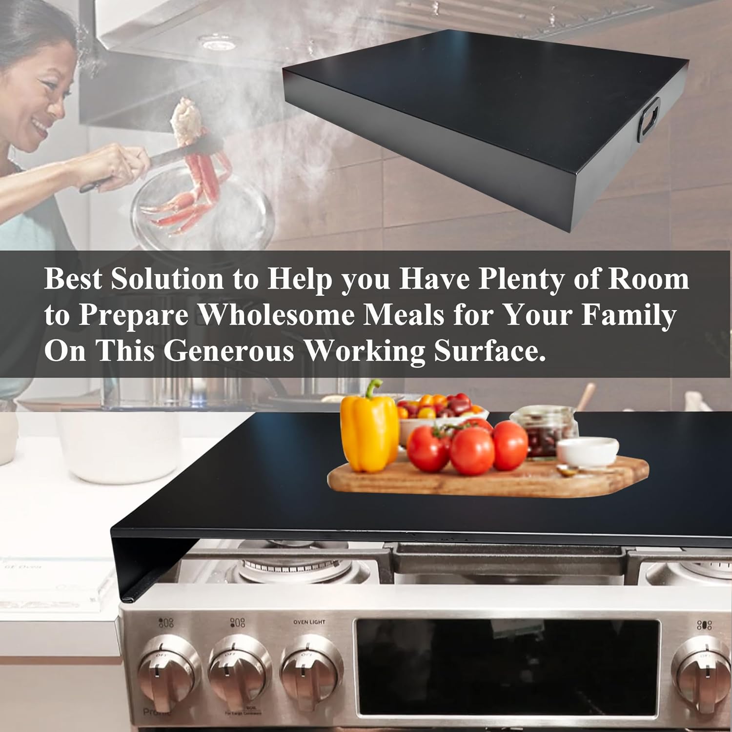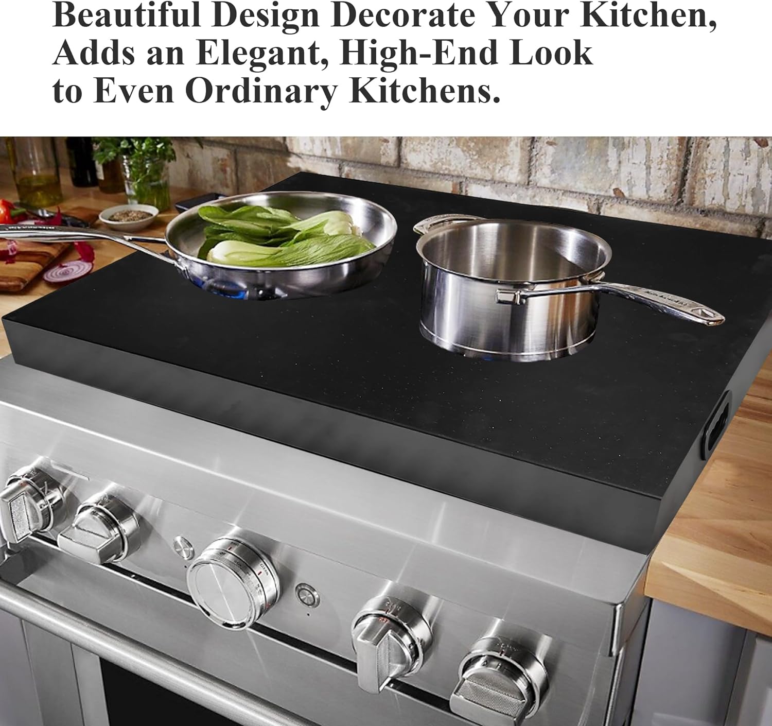 Wide Application: The size of this cooktop cover is 36 x 23.6 x 3 inches this standard size fit for all kinds of gas or electric stove cooktop and burner. It weighs about 8 pounds and can be stably placed on your stove without slipping. It is so heavy and stable. This space saving chopping block can be a countertop cutting tray or can be used over a gas or electric oven to maximize cooking areas.
