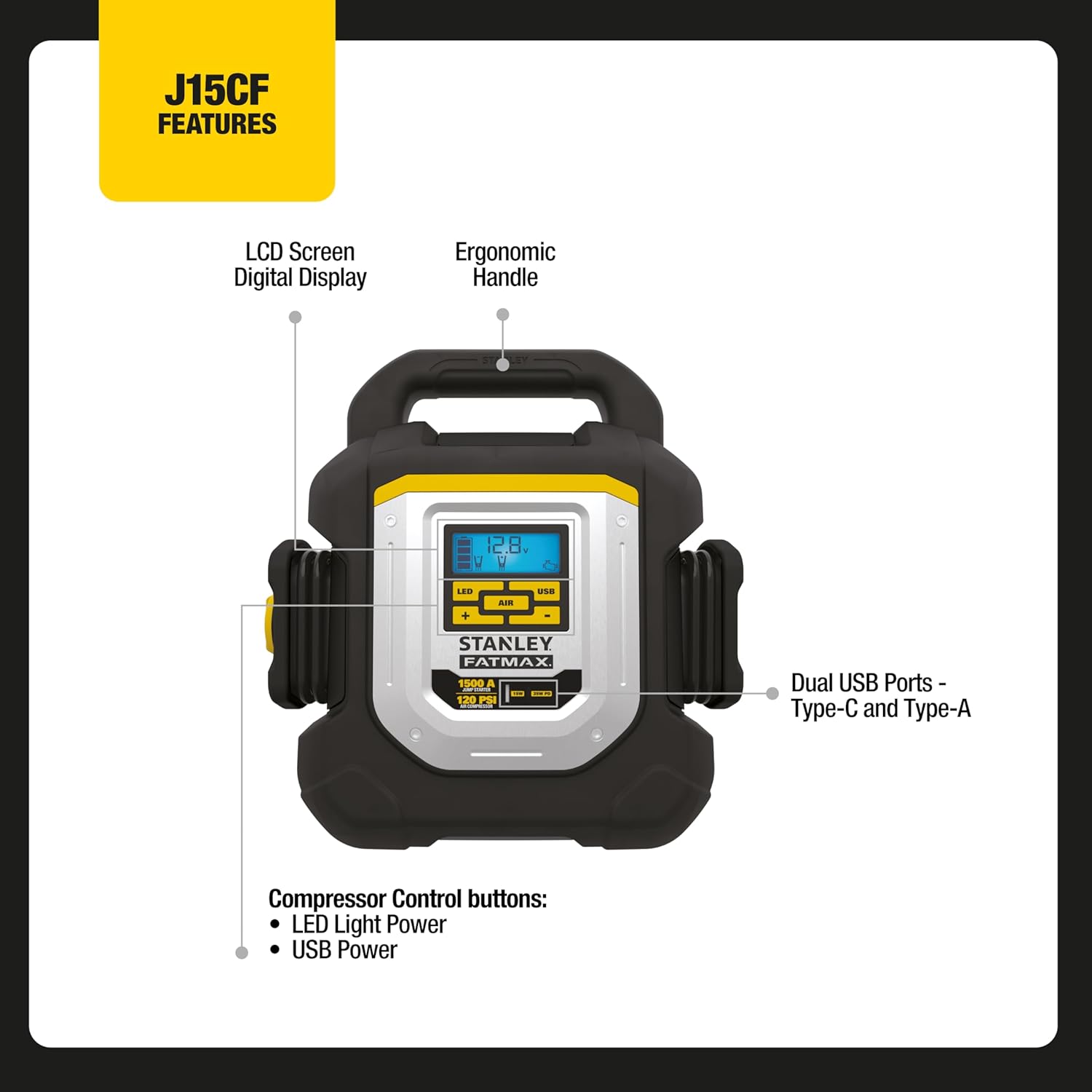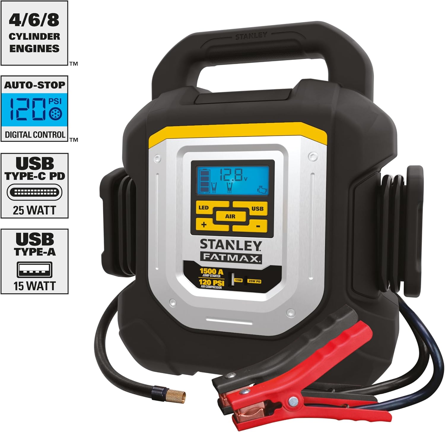 LCD SCREEN - Easy to read icons with info about the battery status voltage air pressure reverse connection warning and USB ports status