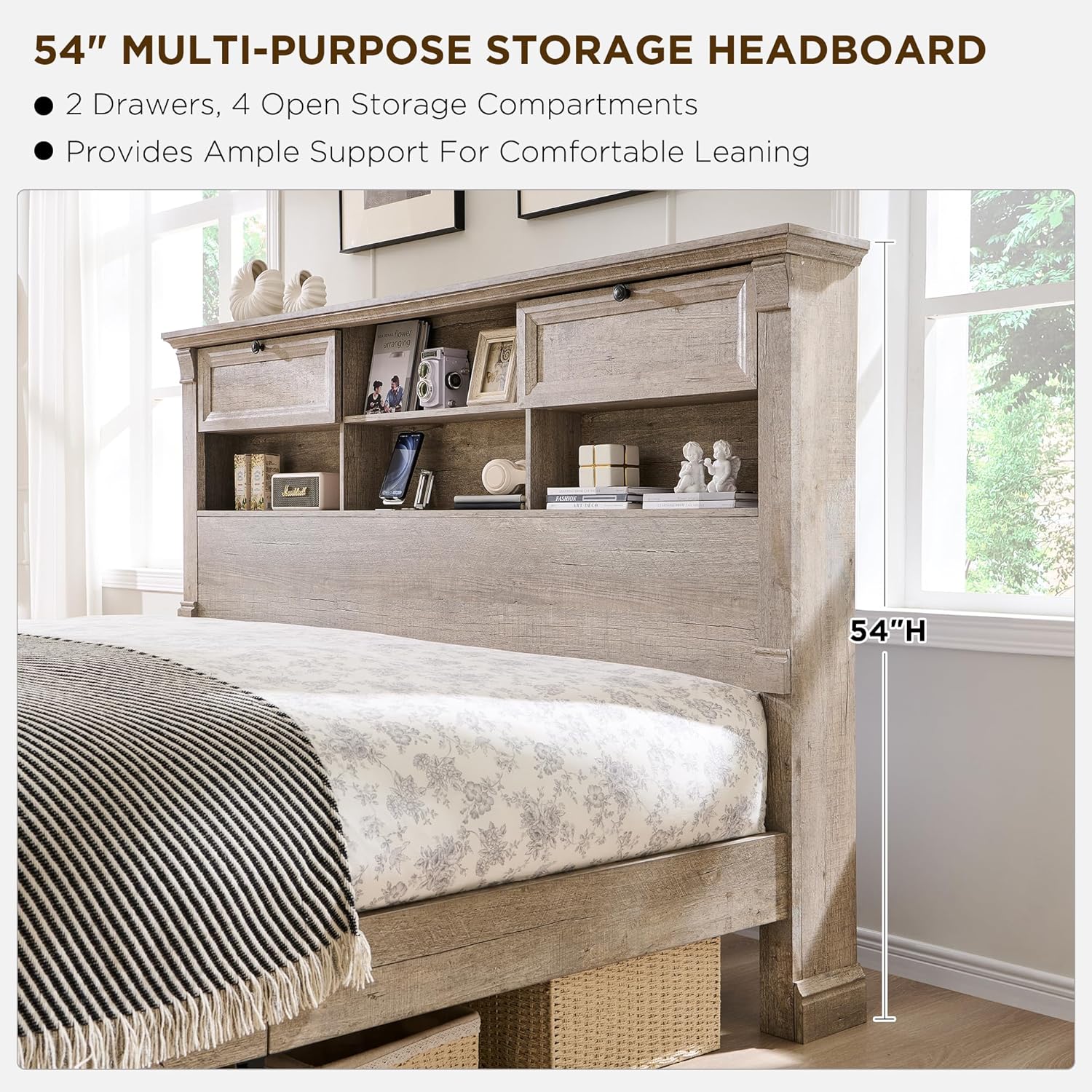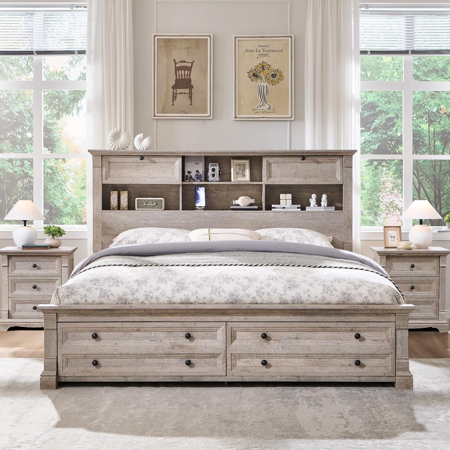 Smart Platform Bed with Storage: Engineered as a queen platform bed frame, it integrates 2 headboard drawers, 4 built-in shelves, and 2 footboard compartments for concealed storage. Designed as a functional bed frame with storage, it maintains minimalist design while offering hidden dual-USB hubs for modern convenience.