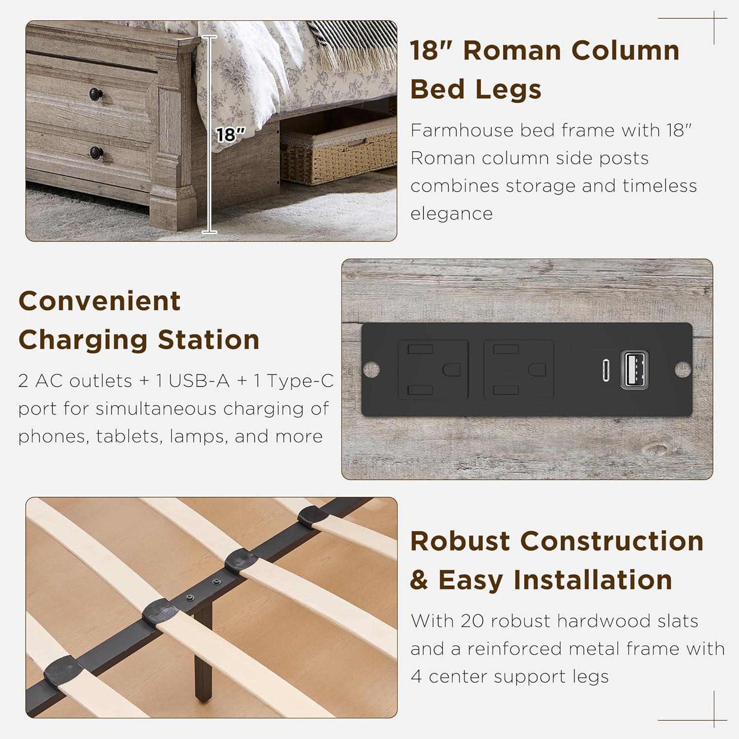 Customizable Queen Platform Bed Options: Available in Antique White, Light/Dark Rustic Oak, and Reclaimed Barnwood. The queen platform bed frame offers simplified assembly with pre-sorted hardware, lifetime warranty, and 24/7 support for seamless integration into any furniture.