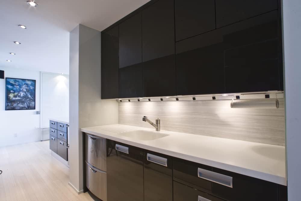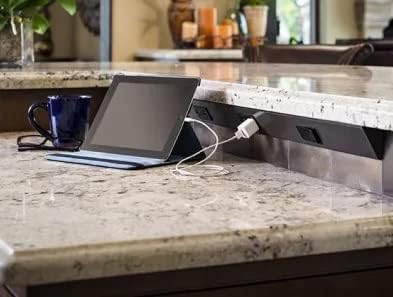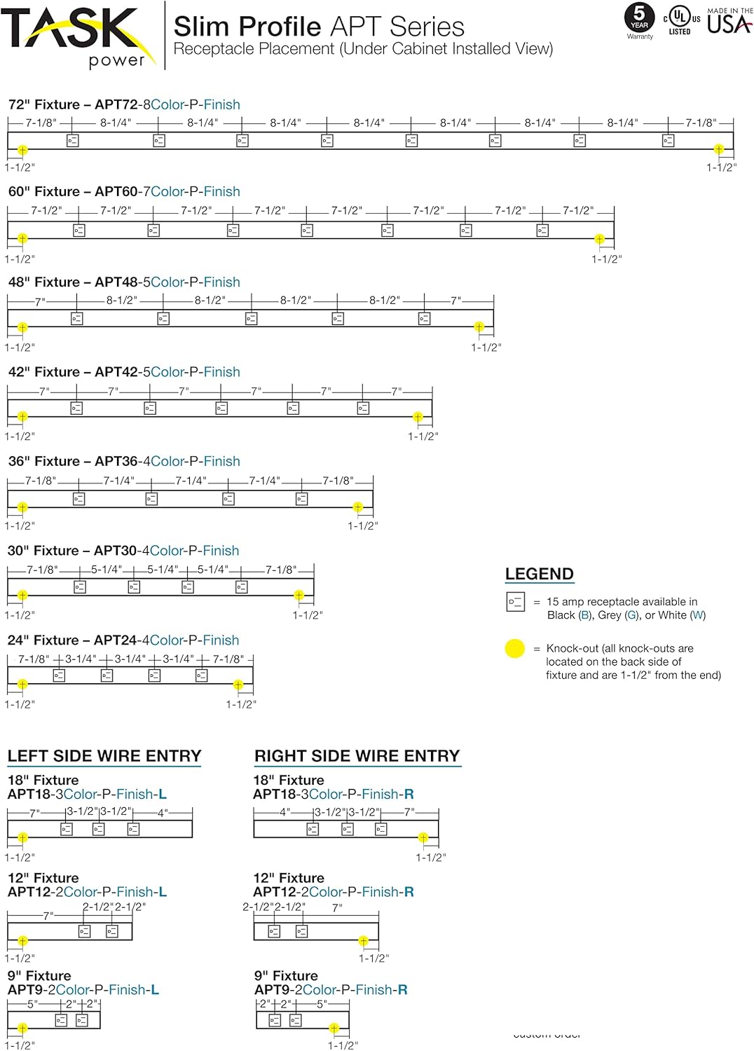 The patented APT Angle Power Strip mounts under cabinets and countertops and is an ideal alternative to standard outlets that are cut into tile glass wood panels metal and other solid surfaces. The fixture is easily hidden while the angle offers easy access to receptacles. Use in the kitchen bathroom office shop craft room and home entertainment center. Custom options include length additional receptacles and switches for lights and garbage disposal. Features 15 amp tamper resistant receptacles. Meets 2008 NEC. Mounting hardware included. Requires installation by licensed electrician.